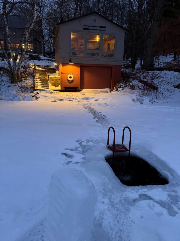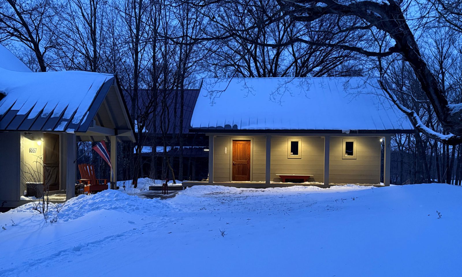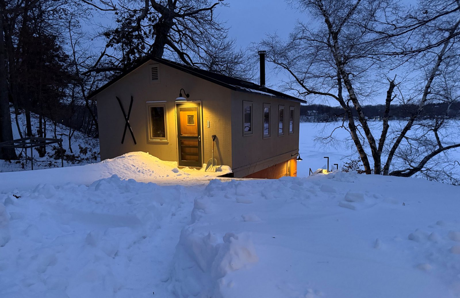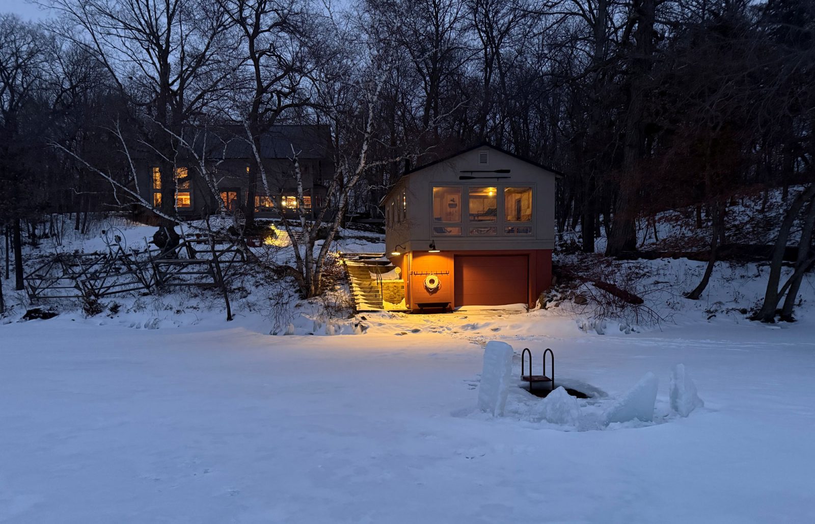 A large space with separate but open rooms is defined by a timber frame structure, and each area has an axial focus: wood stove, lake view, or stone fireplace. Exposed timber beams and pine tongue-and-groove ceiling boards salvaged from the original cabin retain a link to the past, while expansive glass captures the view and fills the space with light.