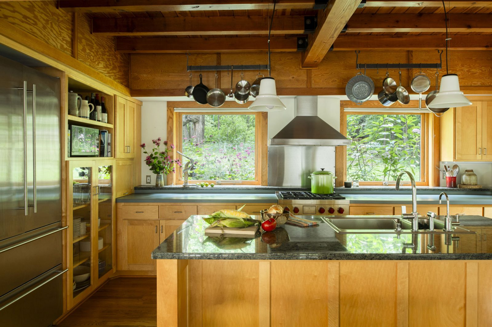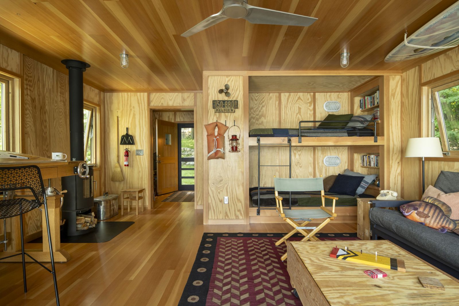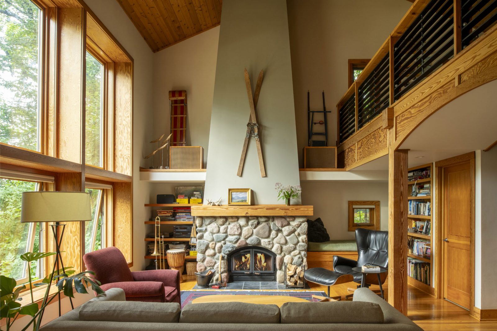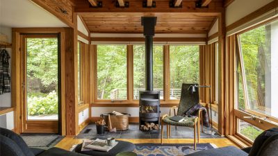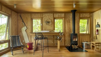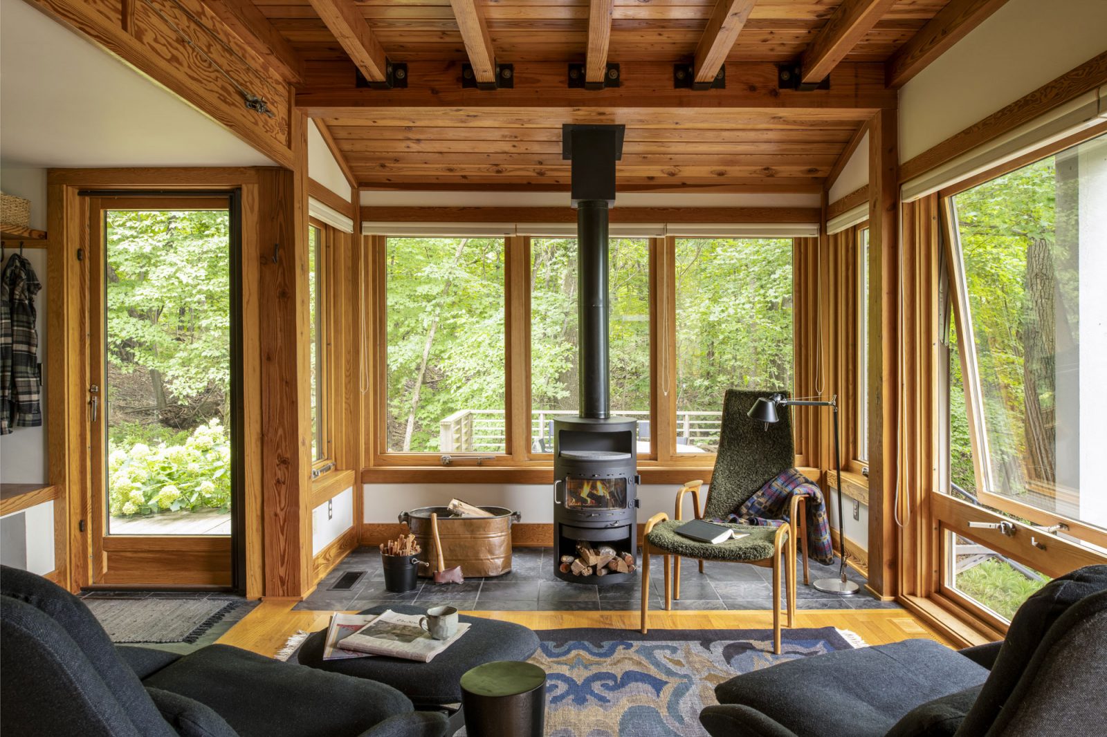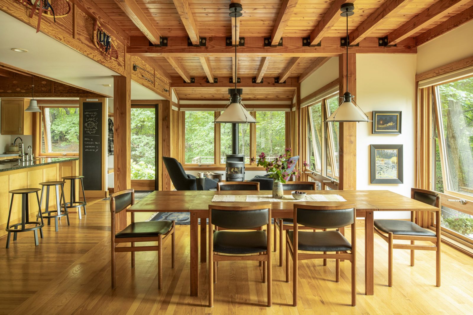 A large space with separate but open rooms is defined by a timber frame structure, and each area has an axial focus: wood stove, lake view, or stone fireplace. Exposed timber beams and pine tongue-and-groove ceiling boards salvaged from the original cabin retain a link to the past, while expansive glass captures the view and fills the space with light.