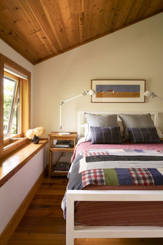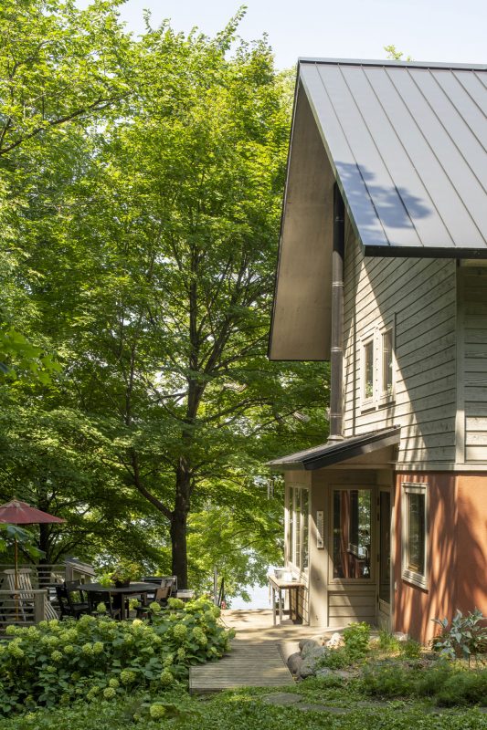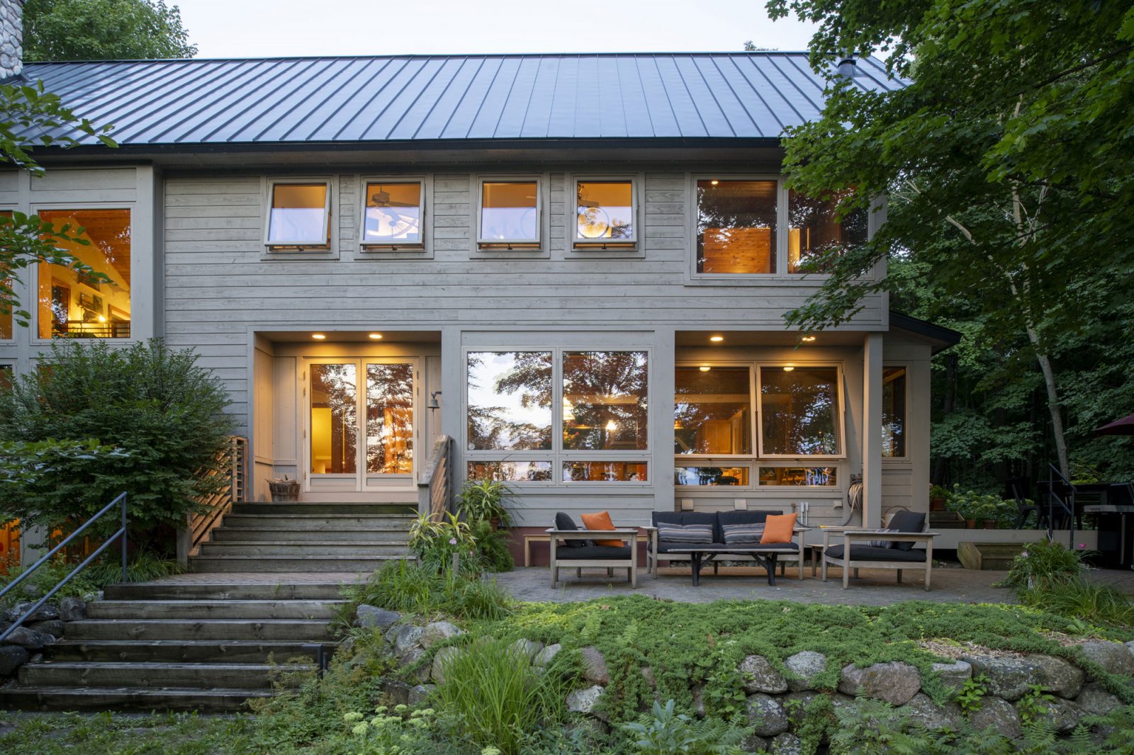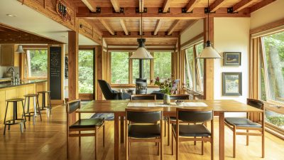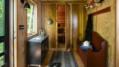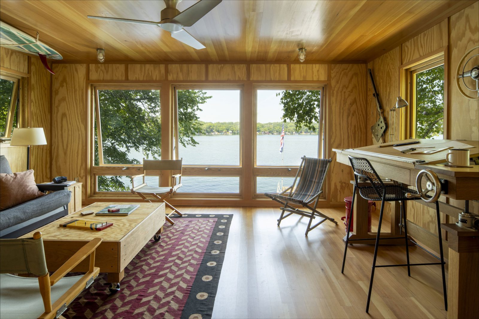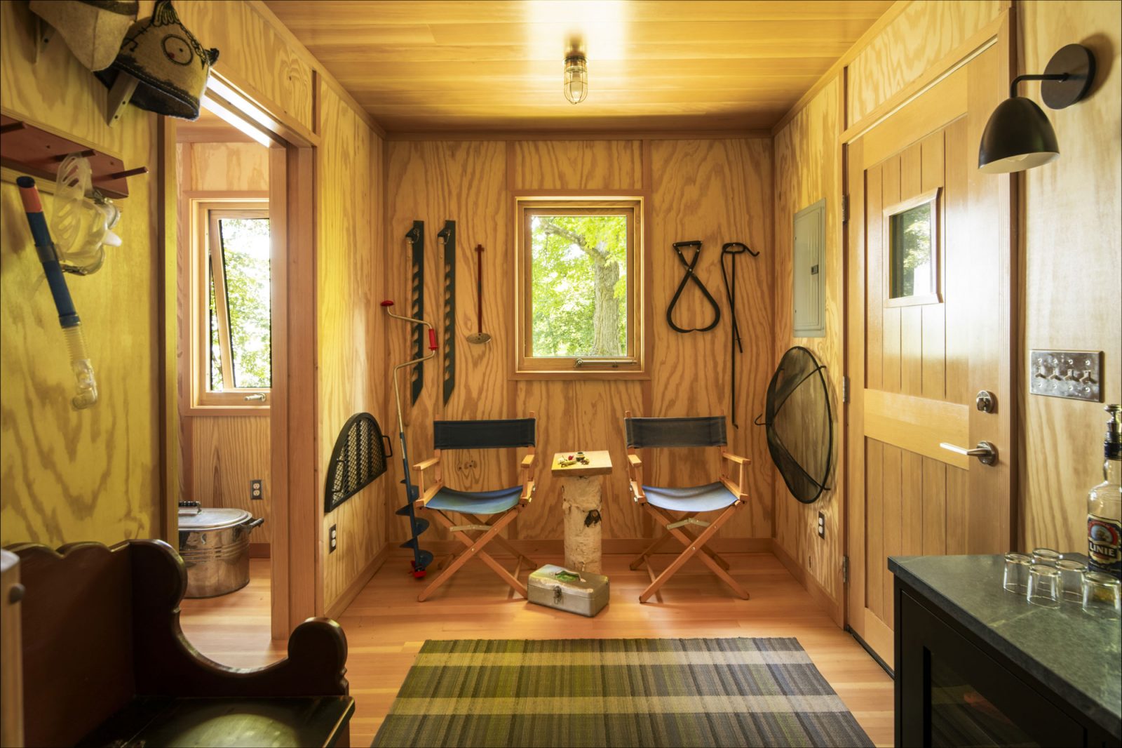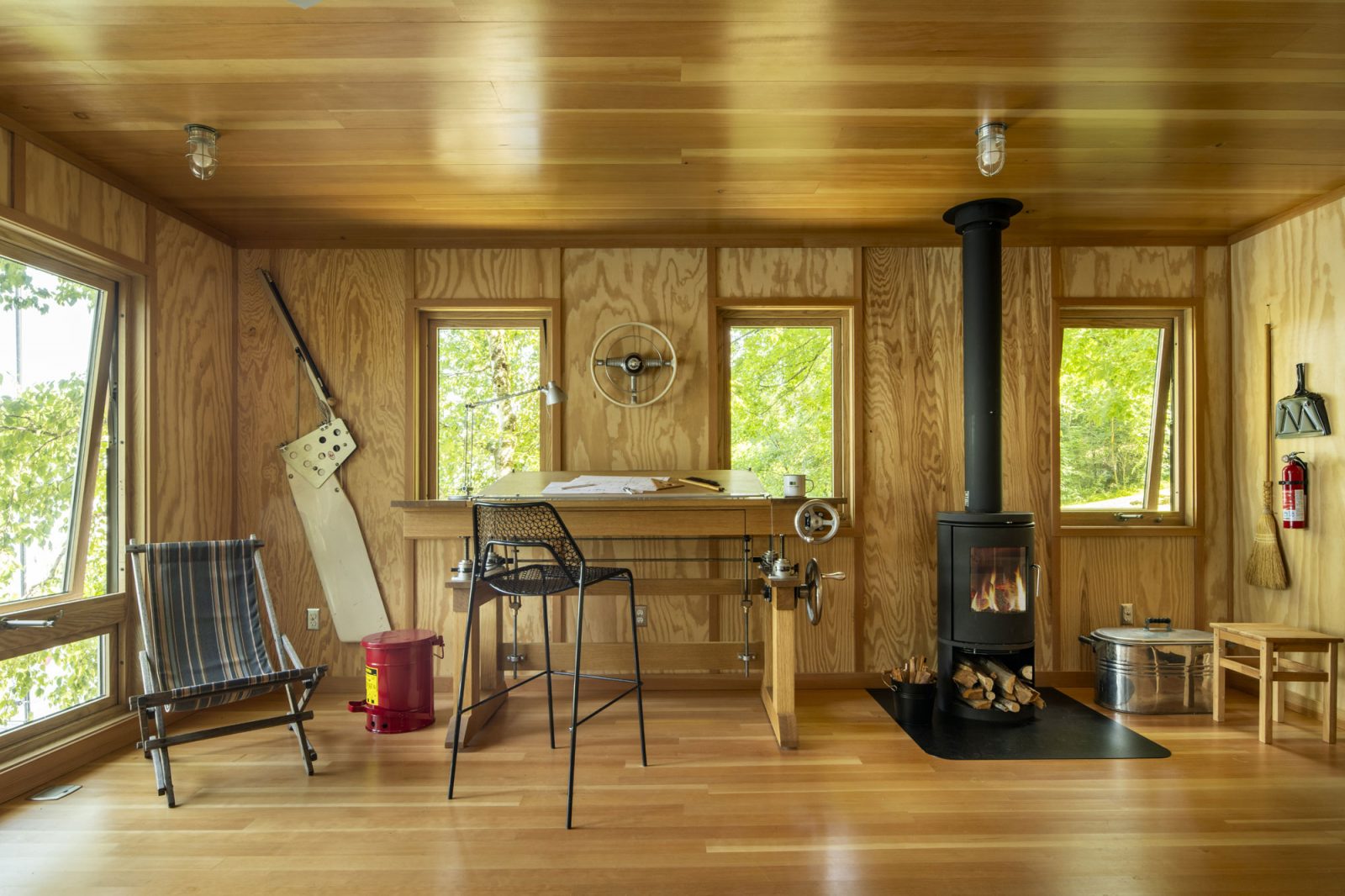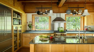 A large space with separate but open rooms is defined by a timber frame structure, and each area has an axial focus: wood stove, lake view, or stone fireplace. Exposed timber beams and pine tongue-and-groove ceiling boards salvaged from the original cabin retain a link to the past, while expansive glass captures the view and fills the space with light.