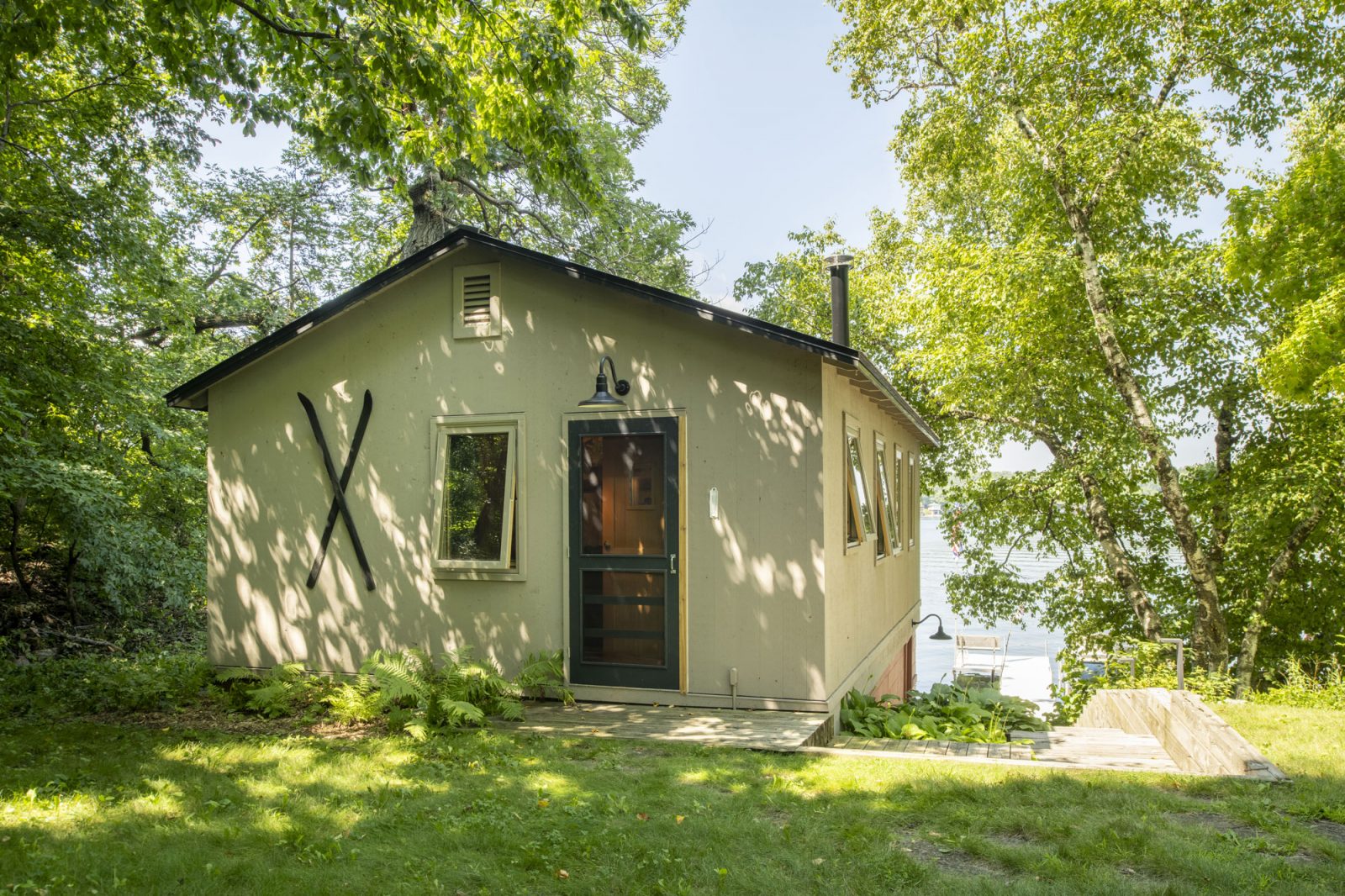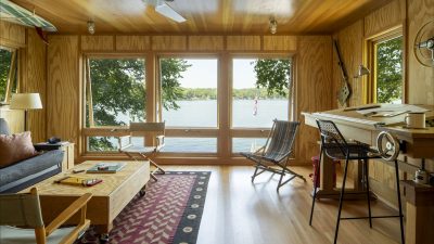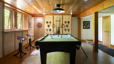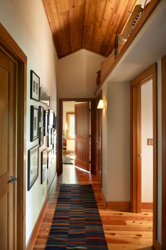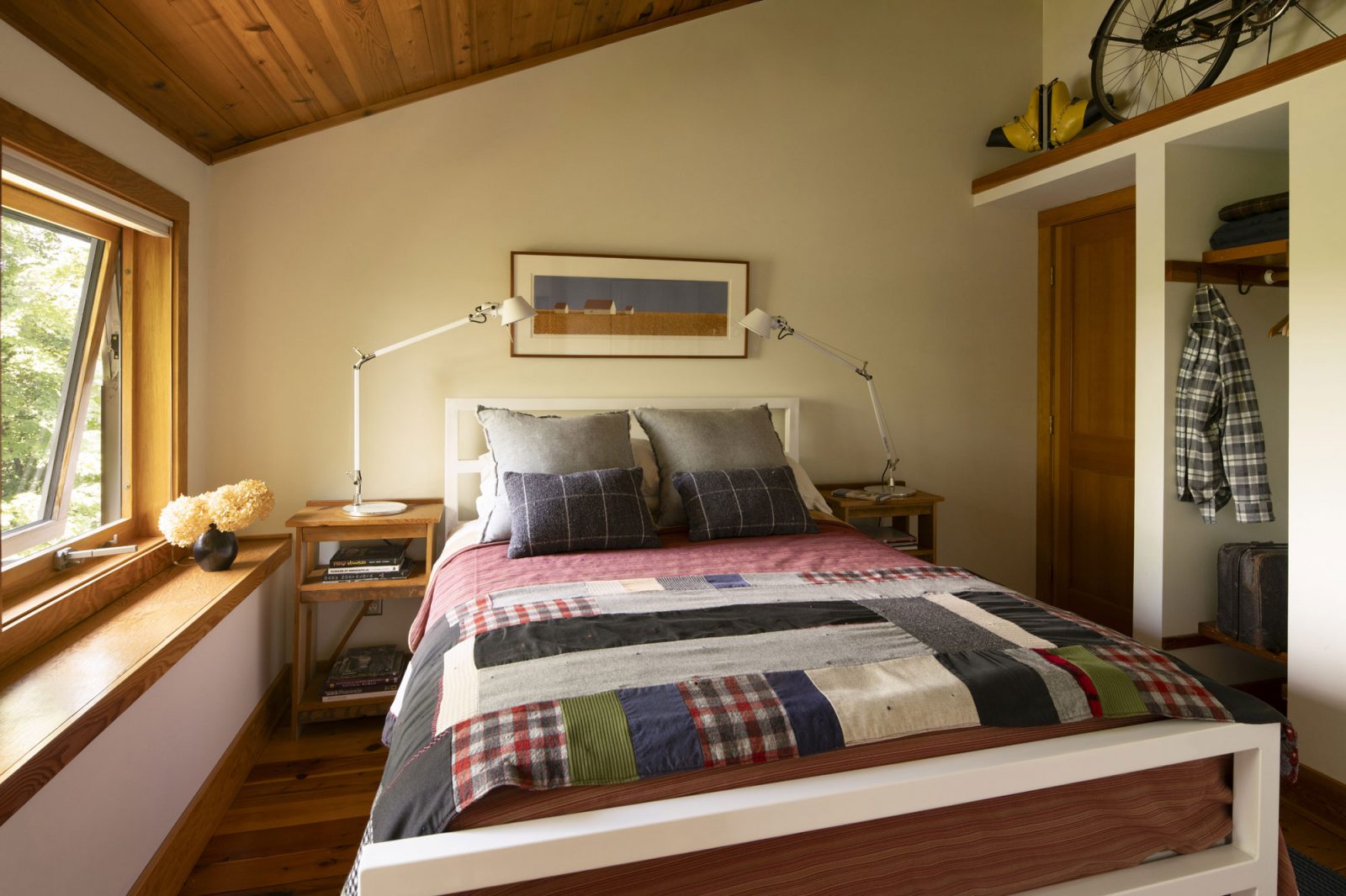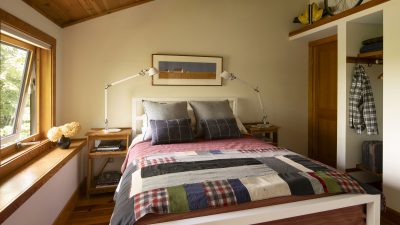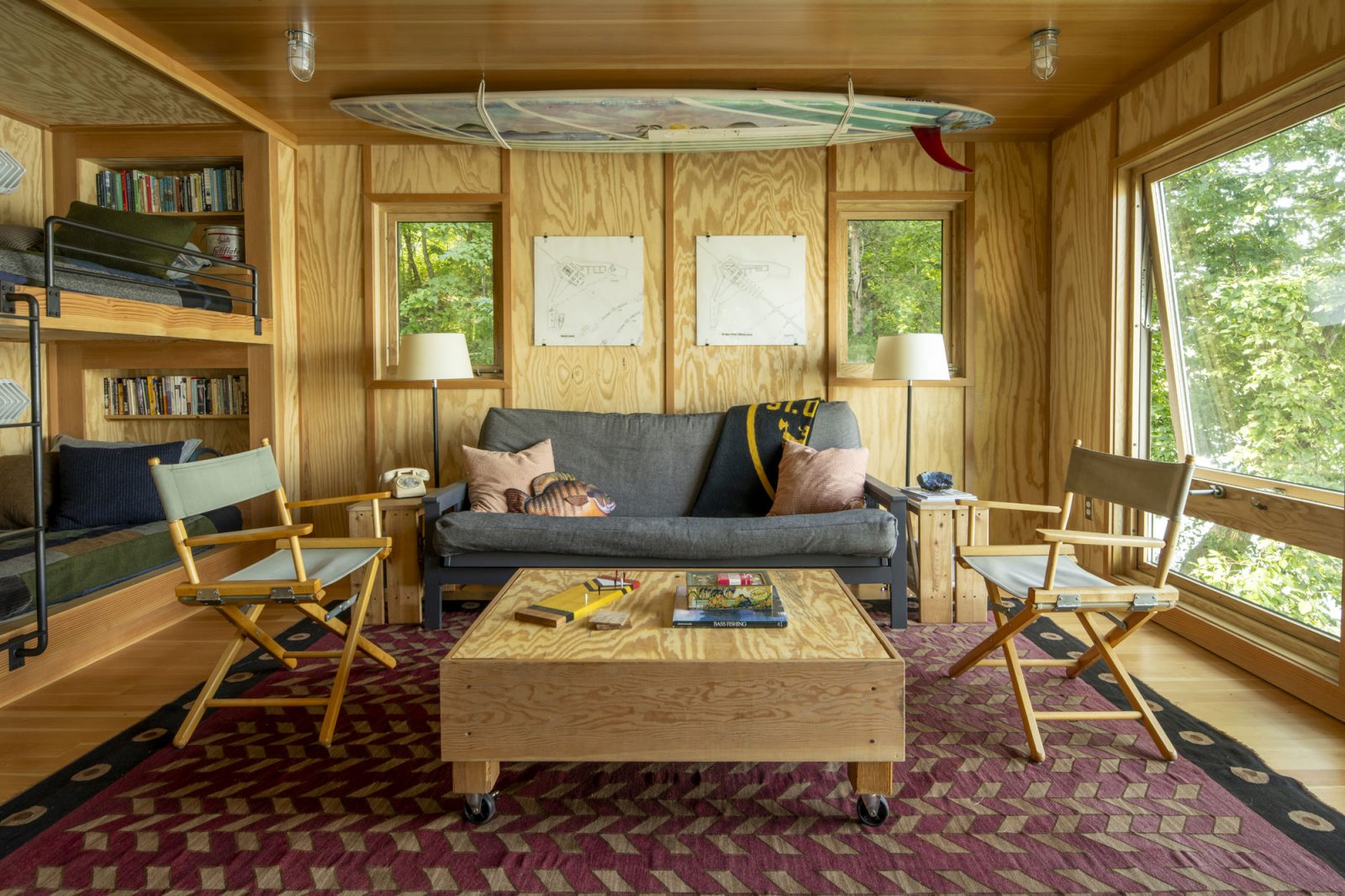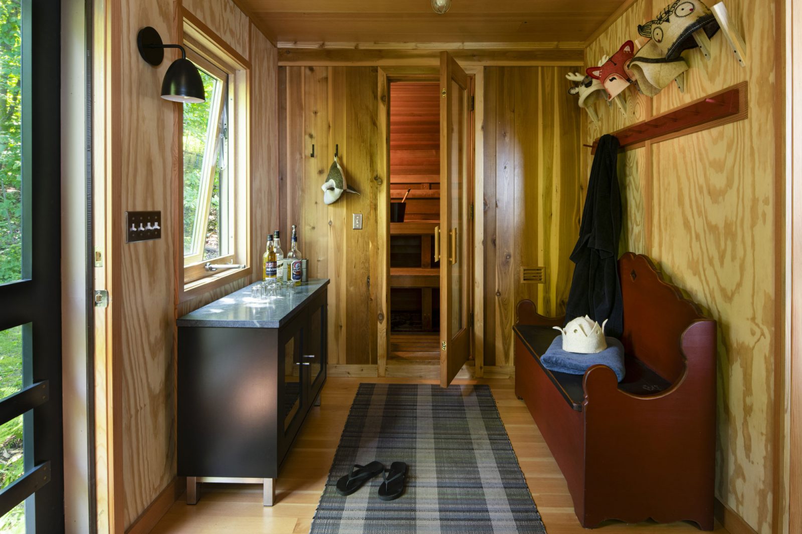 A large space with separate but open rooms is defined by a timber frame structure, and each area has an axial focus: wood stove, lake view, or stone fireplace. Exposed timber beams and pine tongue-and-groove ceiling boards salvaged from the original cabin retain a link to the past, while expansive glass captures the view and fills the space with light.