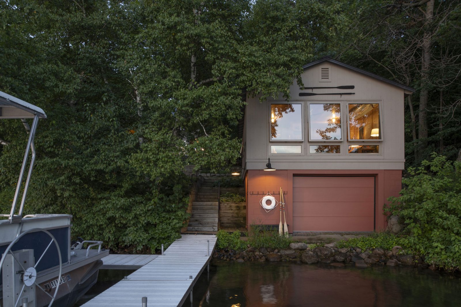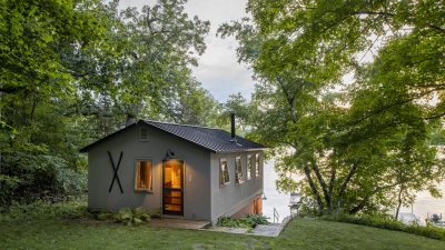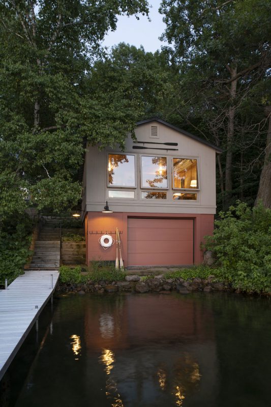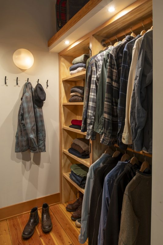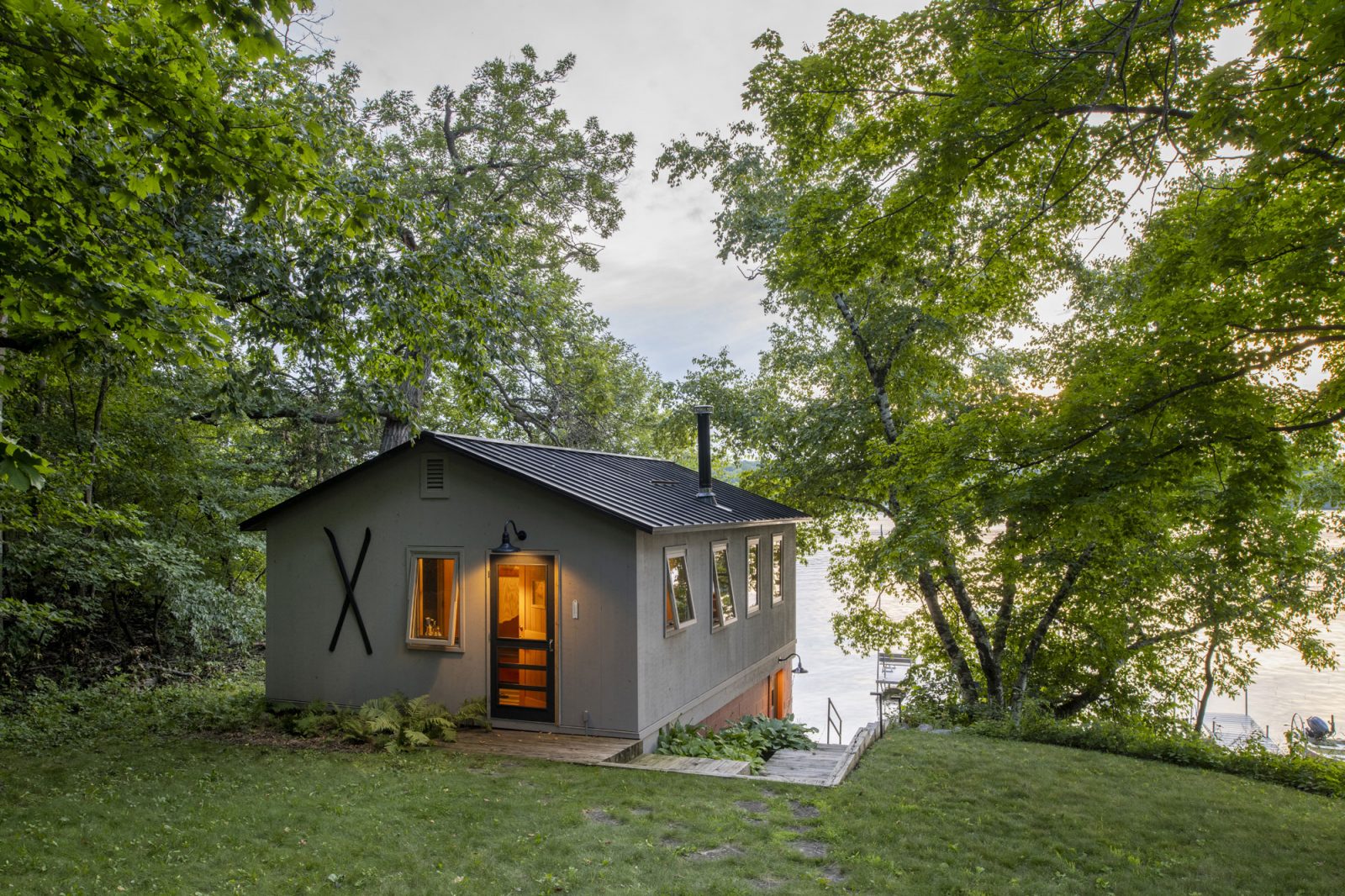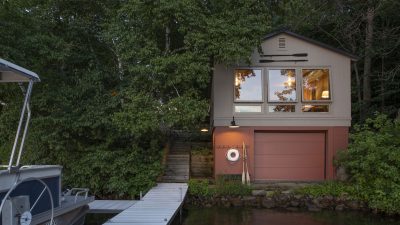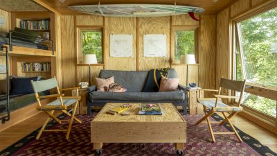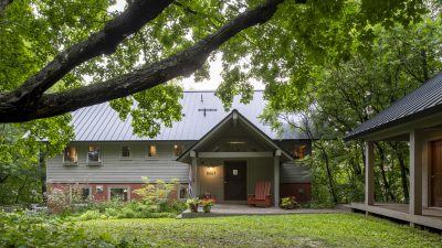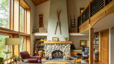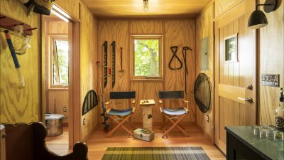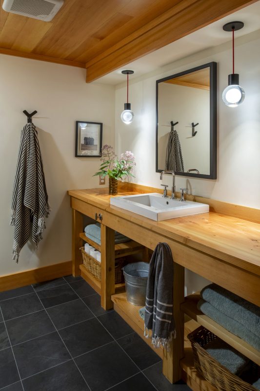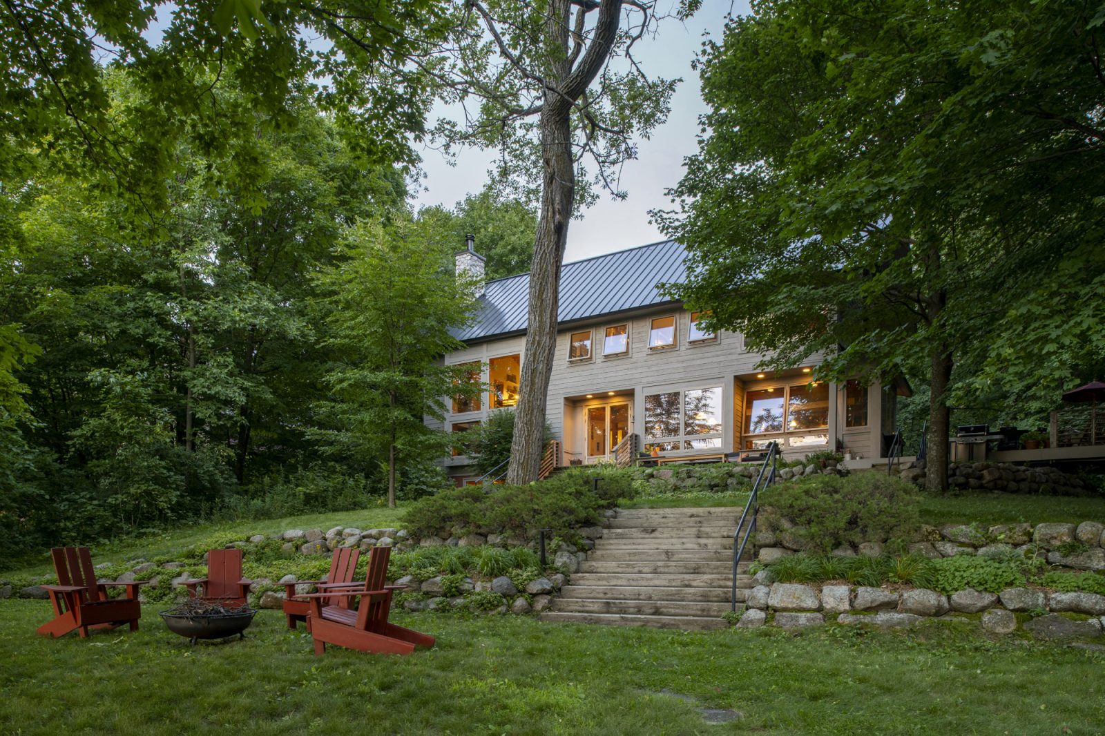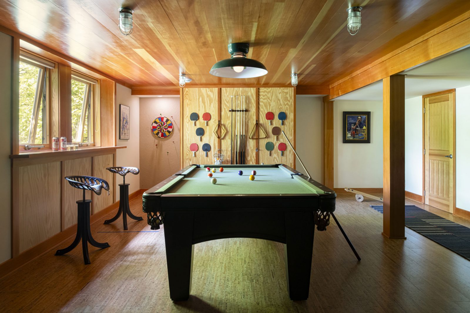 A large space with separate but open rooms is defined by a timber frame structure, and each area has an axial focus: wood stove, lake view, or stone fireplace. Exposed timber beams and pine tongue-and-groove ceiling boards salvaged from the original cabin retain a link to the past, while expansive glass captures the view and fills the space with light.