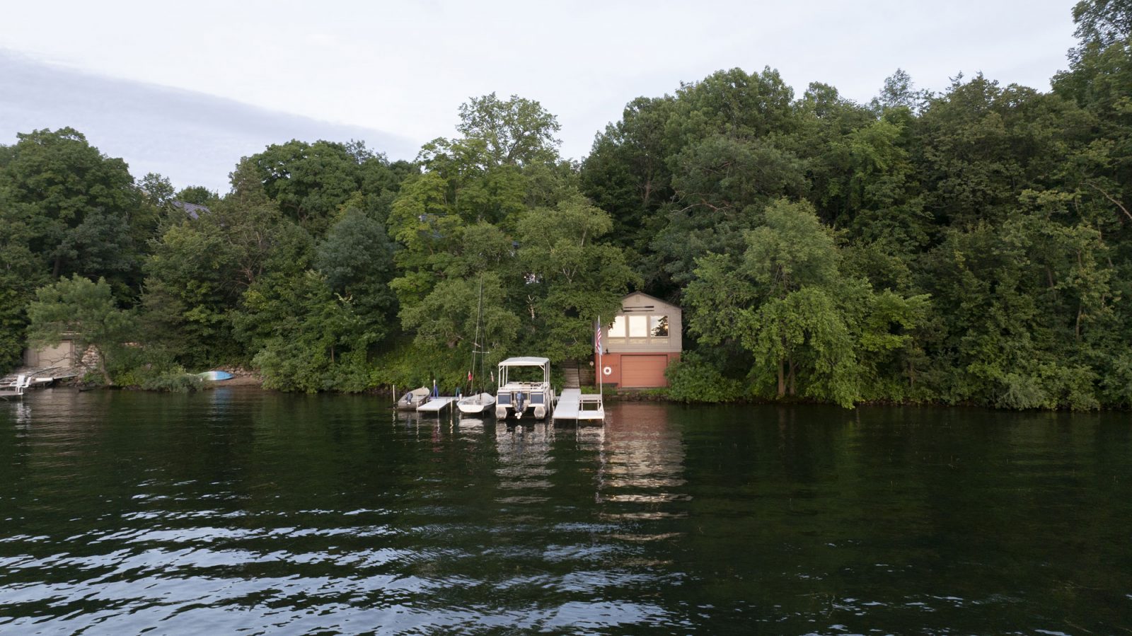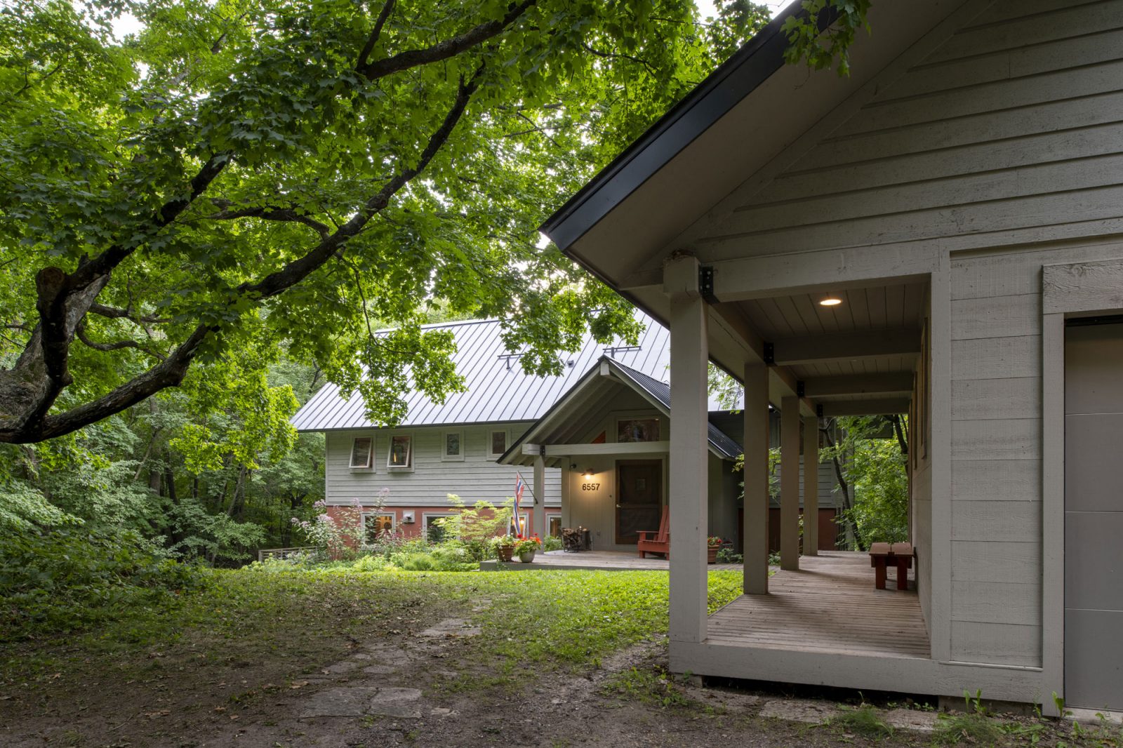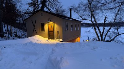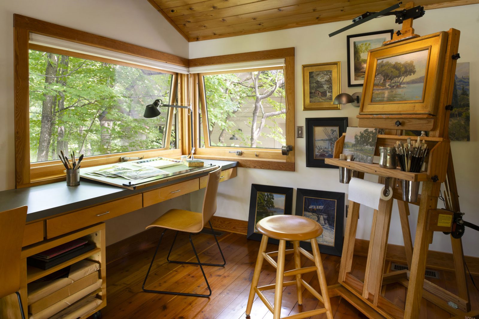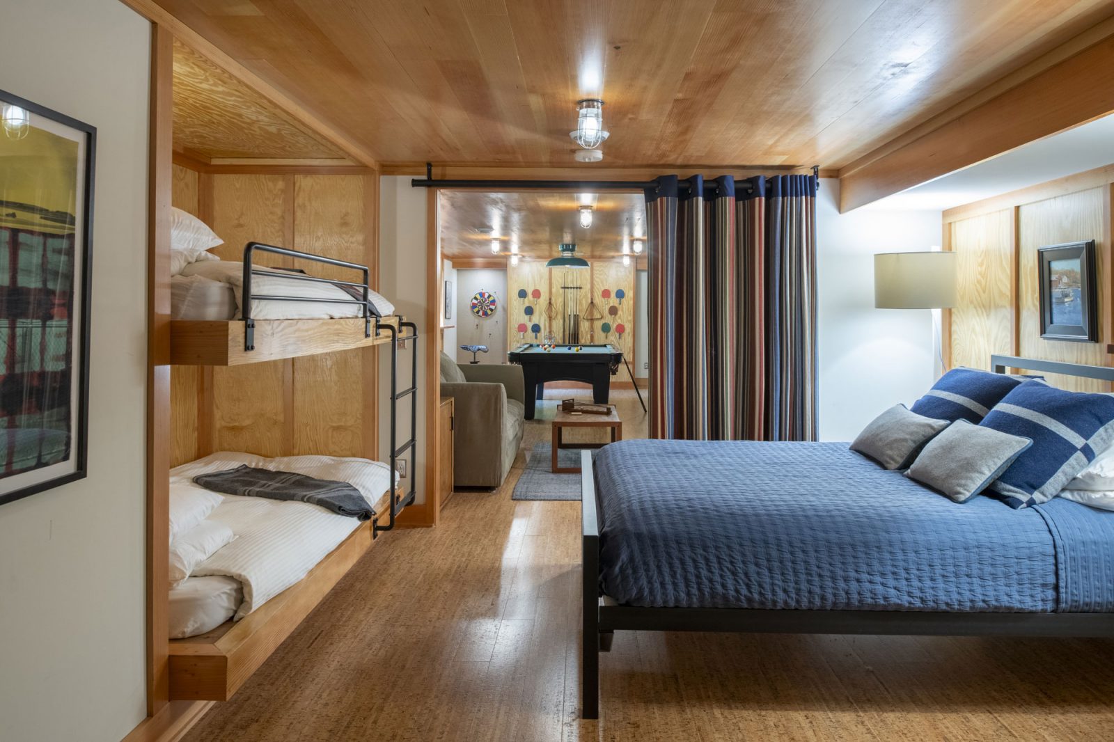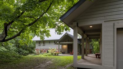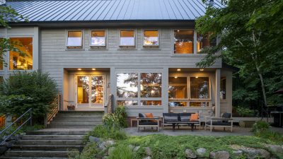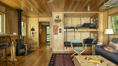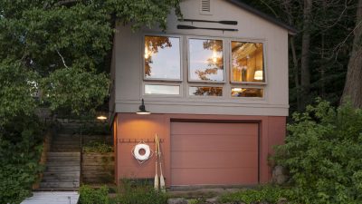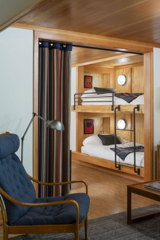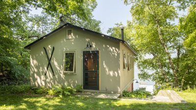 A large space with separate but open rooms is defined by a timber frame structure, and each area has an axial focus: wood stove, lake view, or stone fireplace. Exposed timber beams and pine tongue-and-groove ceiling boards salvaged from the original cabin retain a link to the past, while expansive glass captures the view and fills the space with light.