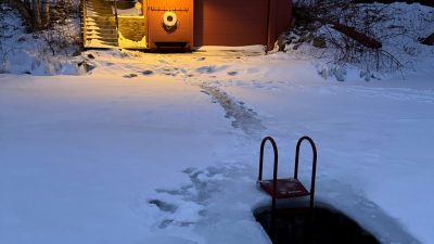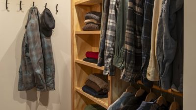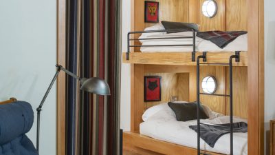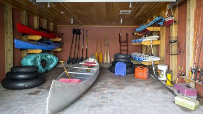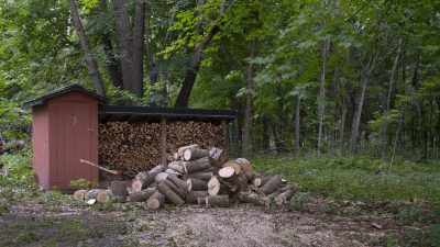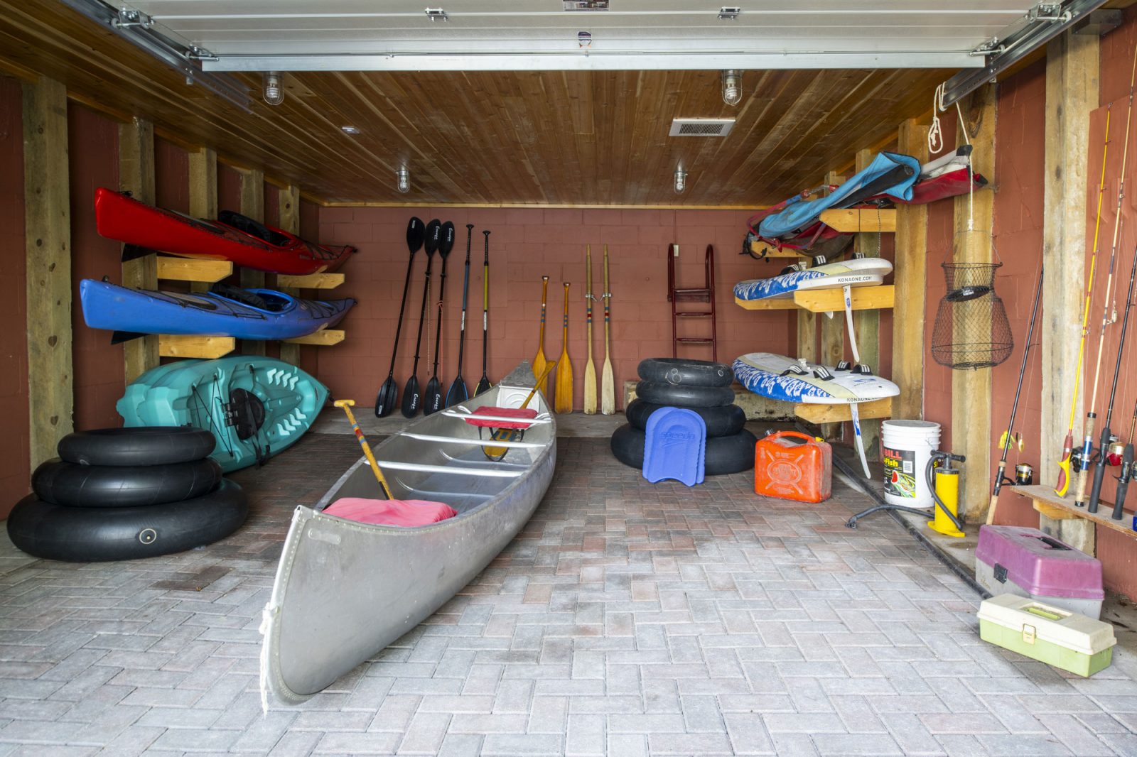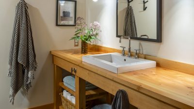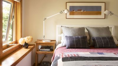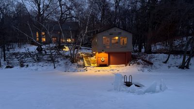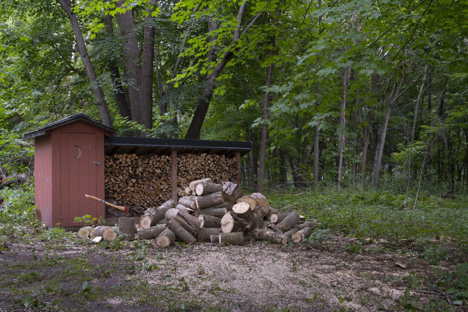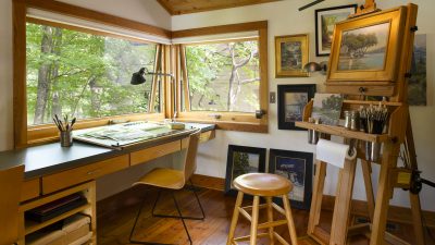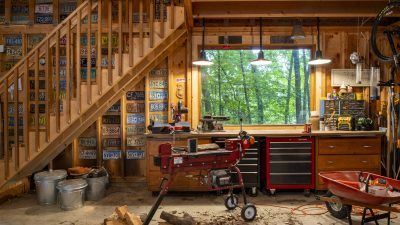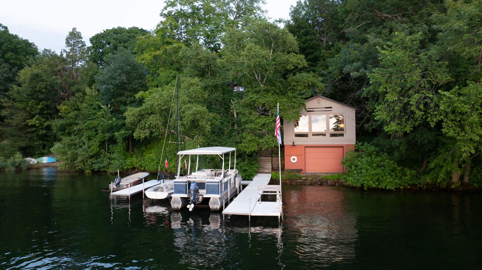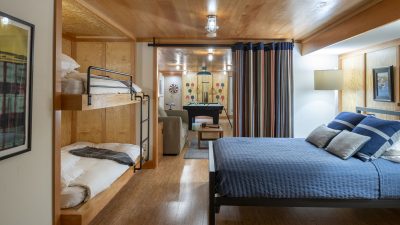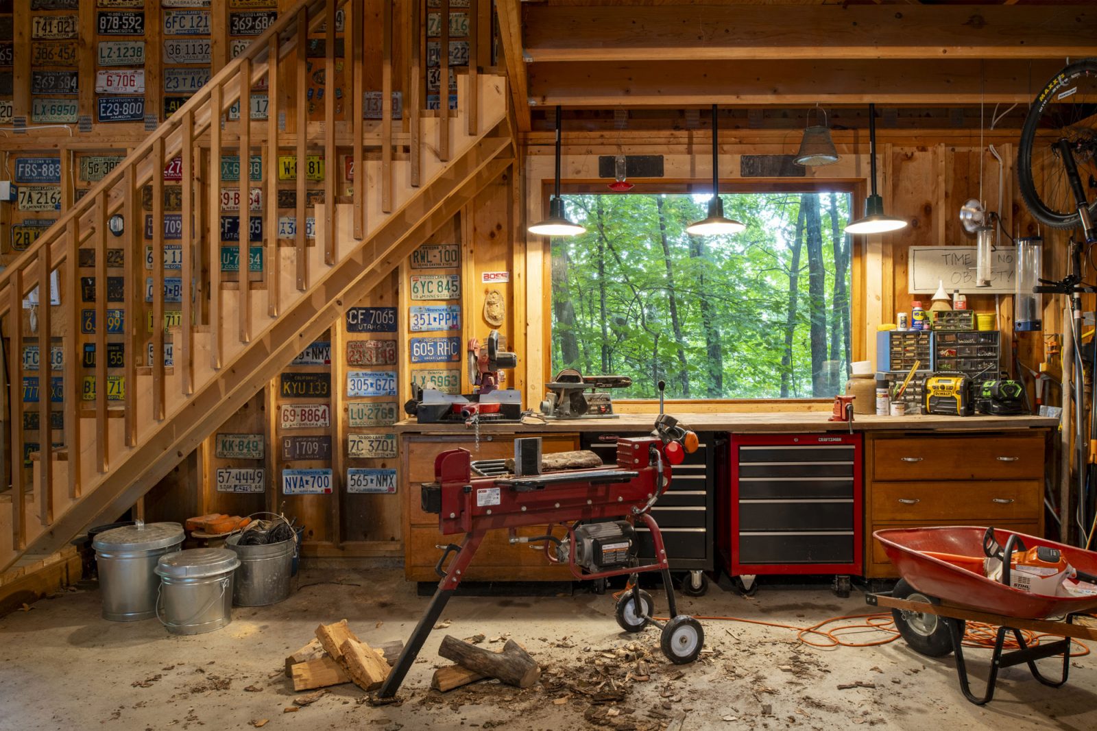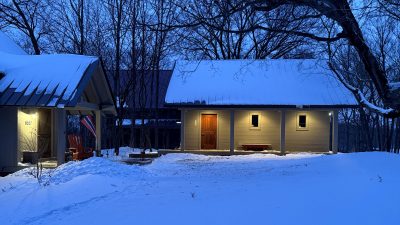 A large space with separate but open rooms is defined by a timber frame structure, and each area has an axial focus: wood stove, lake view, or stone fireplace. Exposed timber beams and pine tongue-and-groove ceiling boards salvaged from the original cabin retain a link to the past, while expansive glass captures the view and fills the space with light.