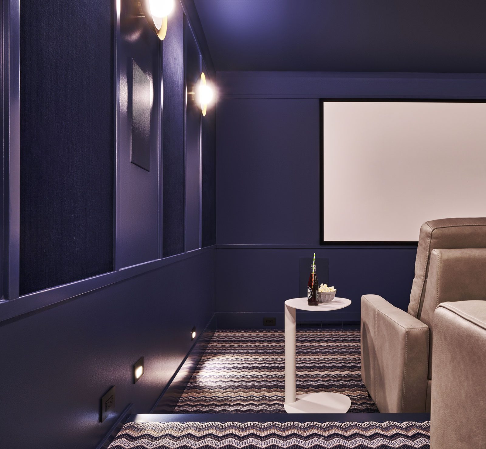In contrast, the lack of sunlight is embraced on the lower level. A bar sits adjacent to a social space that comfortably accommodates both a grand piano and a ping pong table, with art displayed on the exposed concrete walls. The theater room is decked out with blue velvet wall panels and a knife edge coved ceiling floating above. In the moody home spa with hot tub, sauna, and cold plunge, a mix of wall finishes strikes balance between warm and cold — exposed concrete is complemented by a full-scale wallpaper mural and cedar at the sauna entrance.