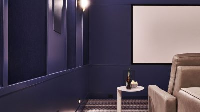 In contrast, the lack of sunlight is embraced on the lower level. A bar sits adjacent to a social space that comfortably accommodates both a grand piano and a ping pong table, with art displayed on the exposed concrete walls. The theater room is decked out with blue velvet wall panels and a knife edge coved ceiling floating above. In the moody home spa with hot tub, sauna, and cold plunge, a mix of wall finishes strikes balance between warm and cold — exposed concrete is complemented by a full-scale wallpaper mural and cedar at the sauna entrance.