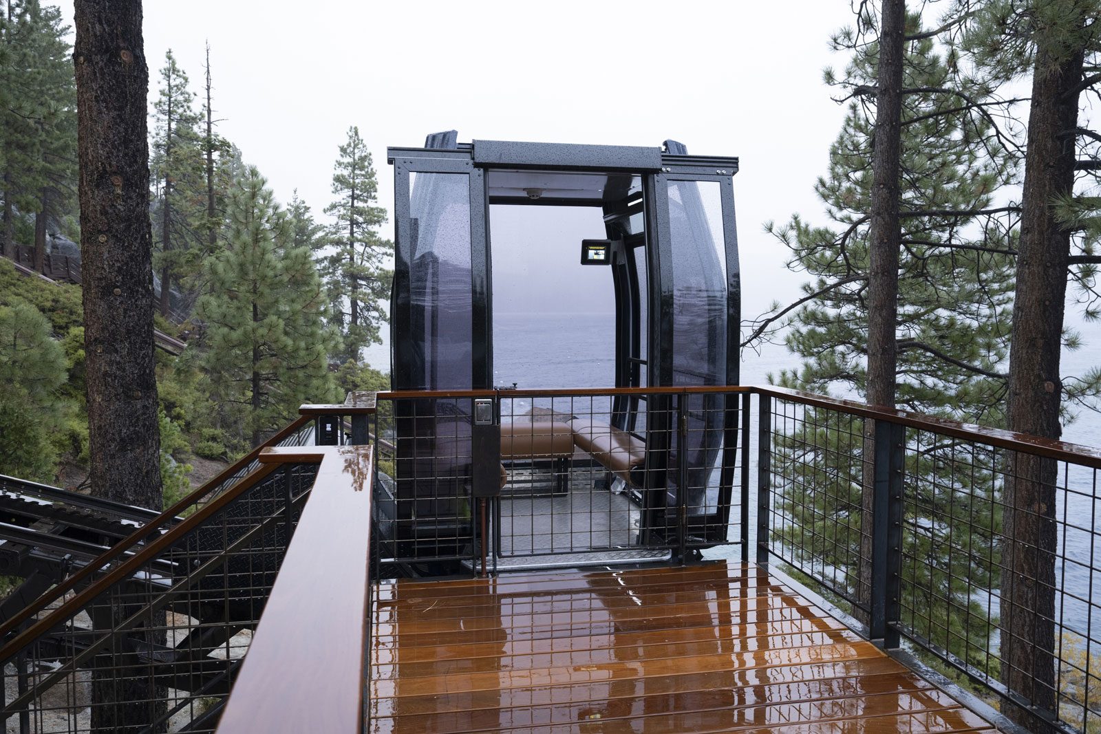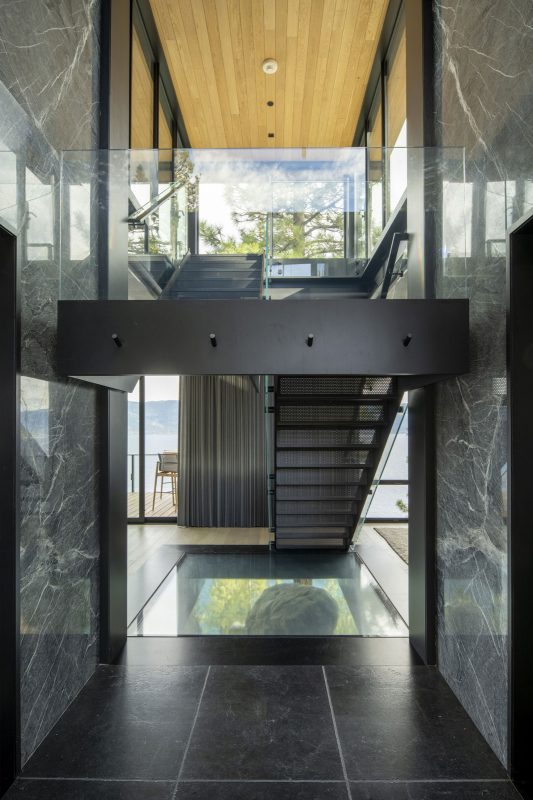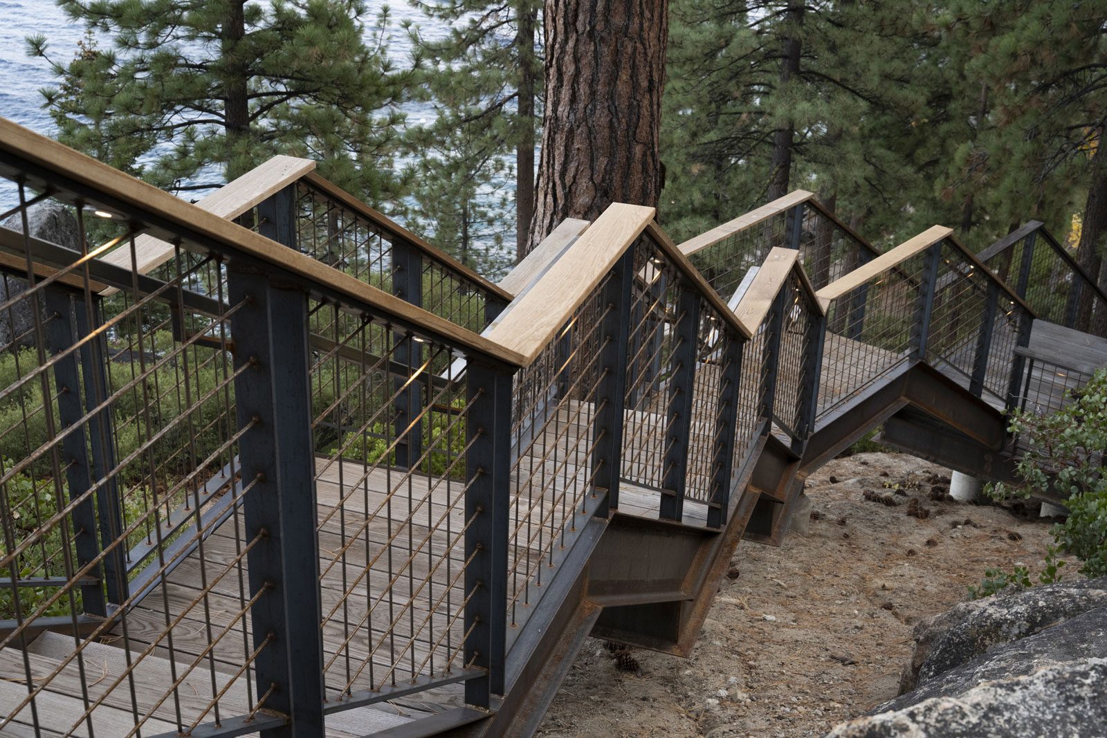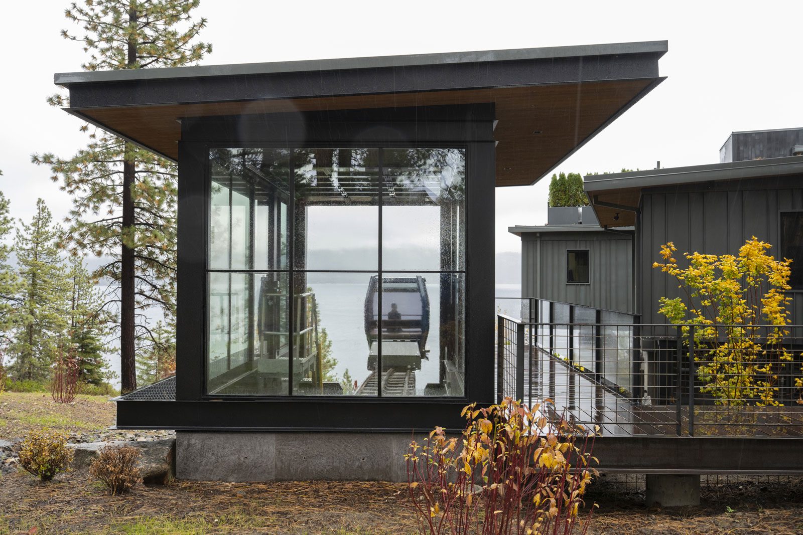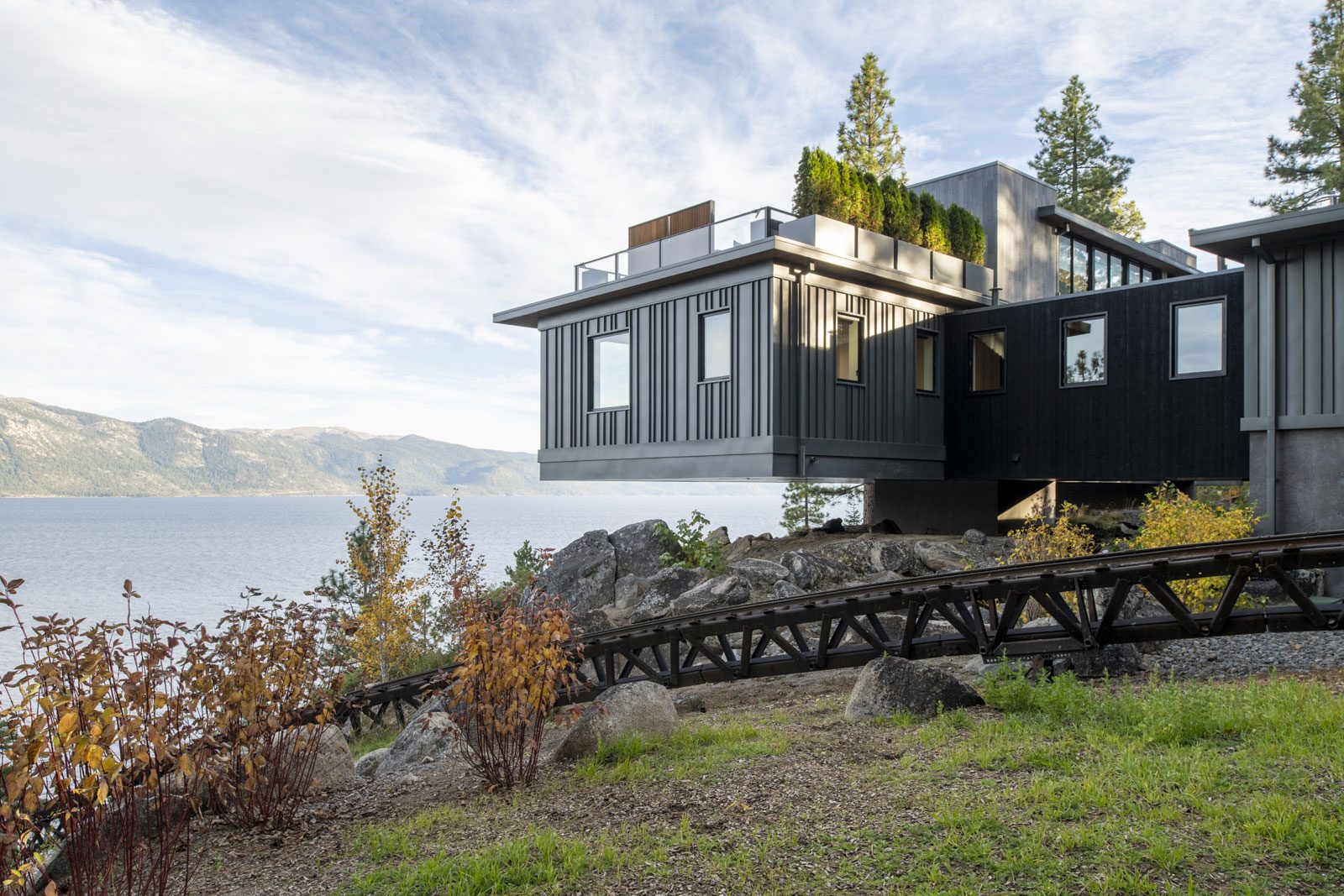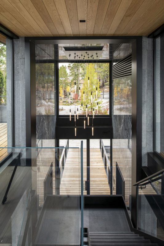The primary residence is set lightly on the land, supported on two concrete piers and cantilevered nearly thirty feet over the edge of the bluff. Water, air and views flow below the building which is connected to the garage by a skyway and to the entry court by bridge. A glass floor just inside the main entry allows a view of the boulders under the building and a first peak of the blue water far below. The design provides privacy from the street, discretely conceal the heroic structural steel and mass timber required to meet heavy snow load and seismic requirements and capture views through the trees to the lake and ski slopes beyond. On the rooftop, accessed by a perforated steel stair, are balconies in the treetops with an outdoor bar, moon deck and firepit. Access to the lakeshore and pier, far below these buildings, is provided by a funicular with undulating steel track hugging the contours of the site or by a stair of steel and thermally treated timber for the less faint of heart.