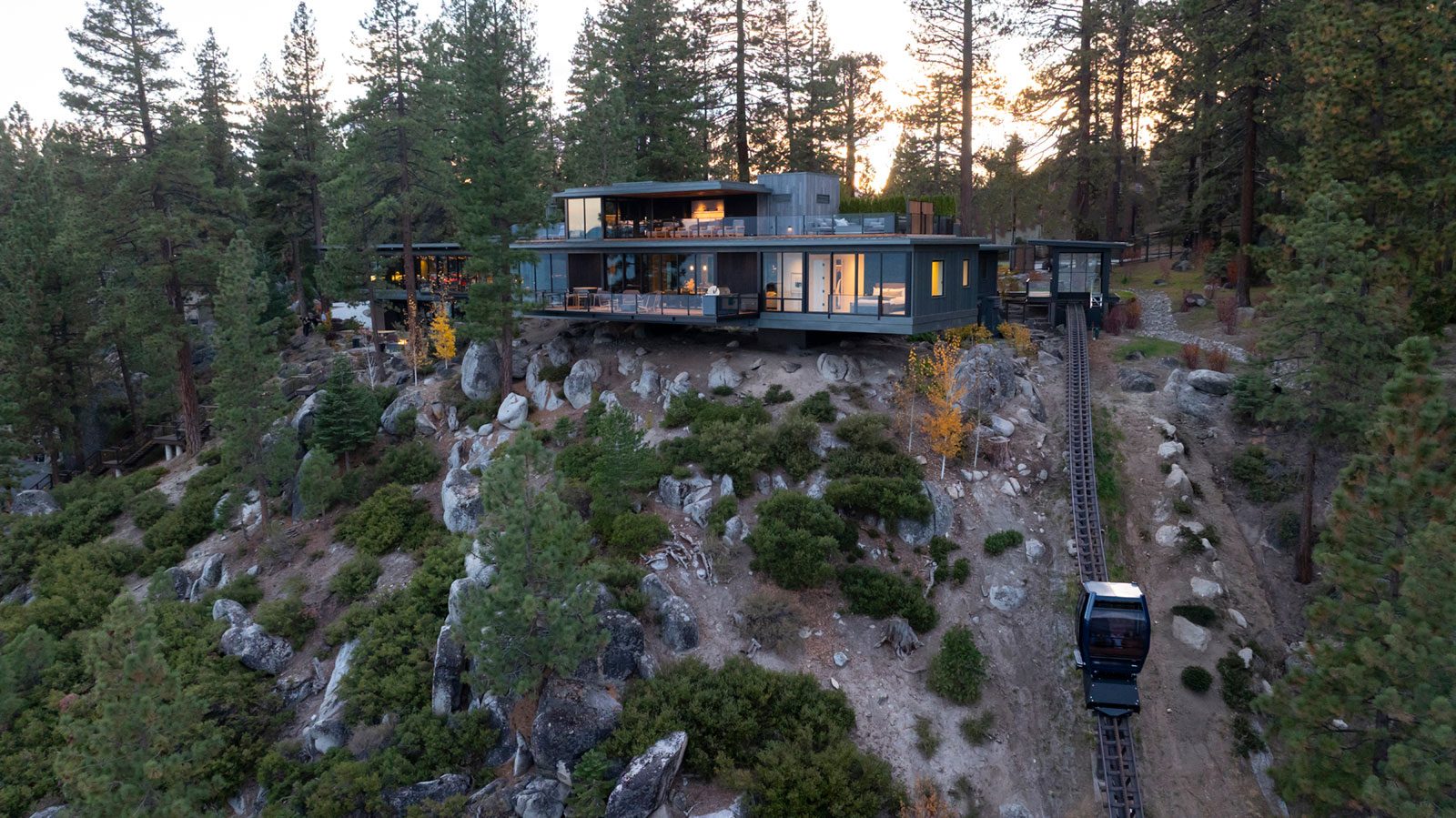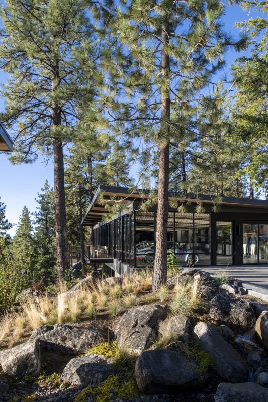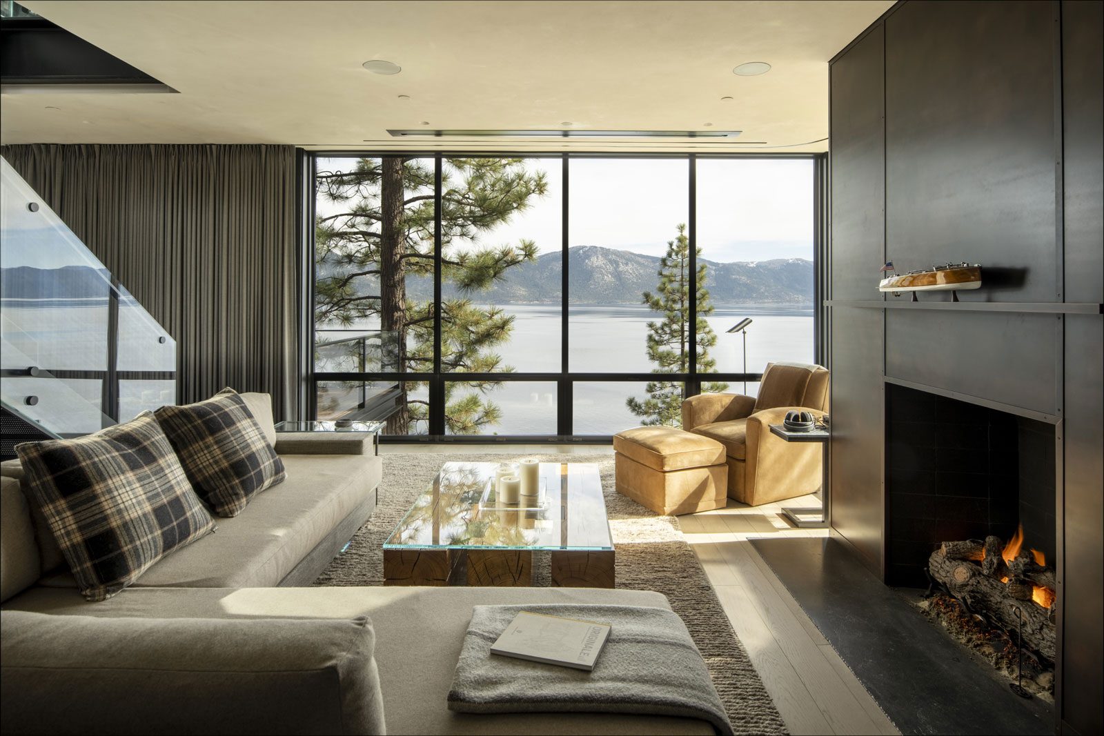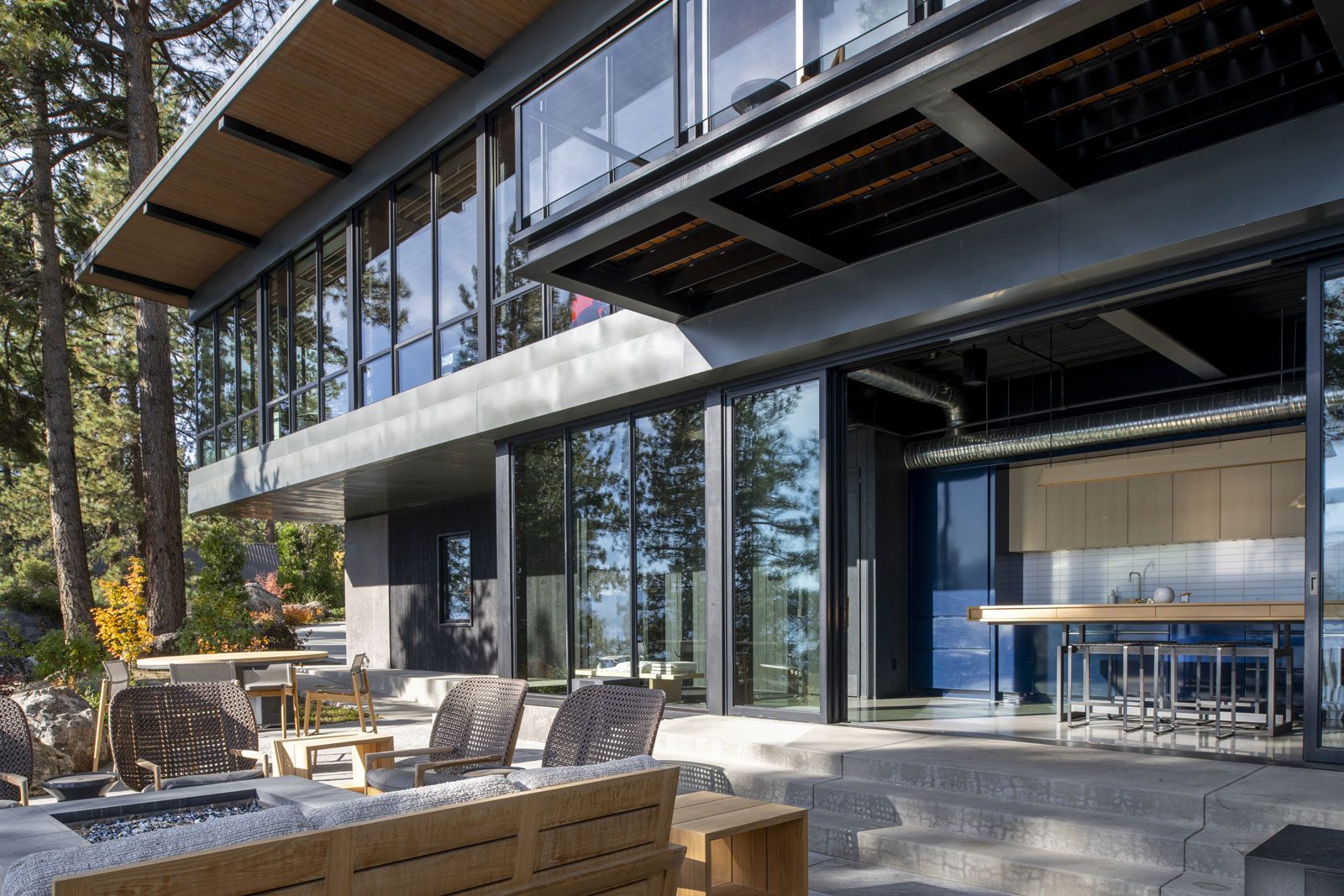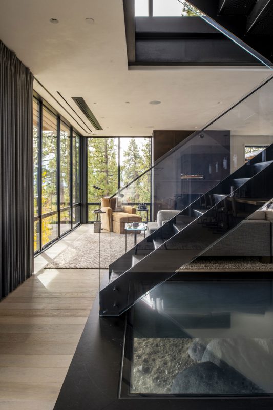 The primary residence is set lightly on the land, supported on two concrete piers and cantilevered nearly thirty feet over the edge of the bluff. Water, air and views flow below the building which is connected to the garage by a skyway and to the entry court by bridge. A glass floor just inside the main entry allows a view of the boulders under the building and a first peak of the blue water far below. The design provides privacy from the street, discretely conceal the heroic structural steel and mass timber required to meet heavy snow load and seismic requirements and capture views through the trees to the lake and ski slopes beyond. On the rooftop, accessed by a perforated steel stair, are balconies in the treetops with an outdoor bar, moon deck and firepit. Access to the lakeshore and pier, far below these buildings, is provided by a funicular with undulating steel track hugging the contours of the site or by a stair of steel and thermally treated timber for the less faint of heart.