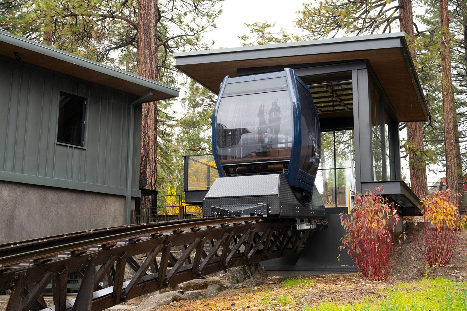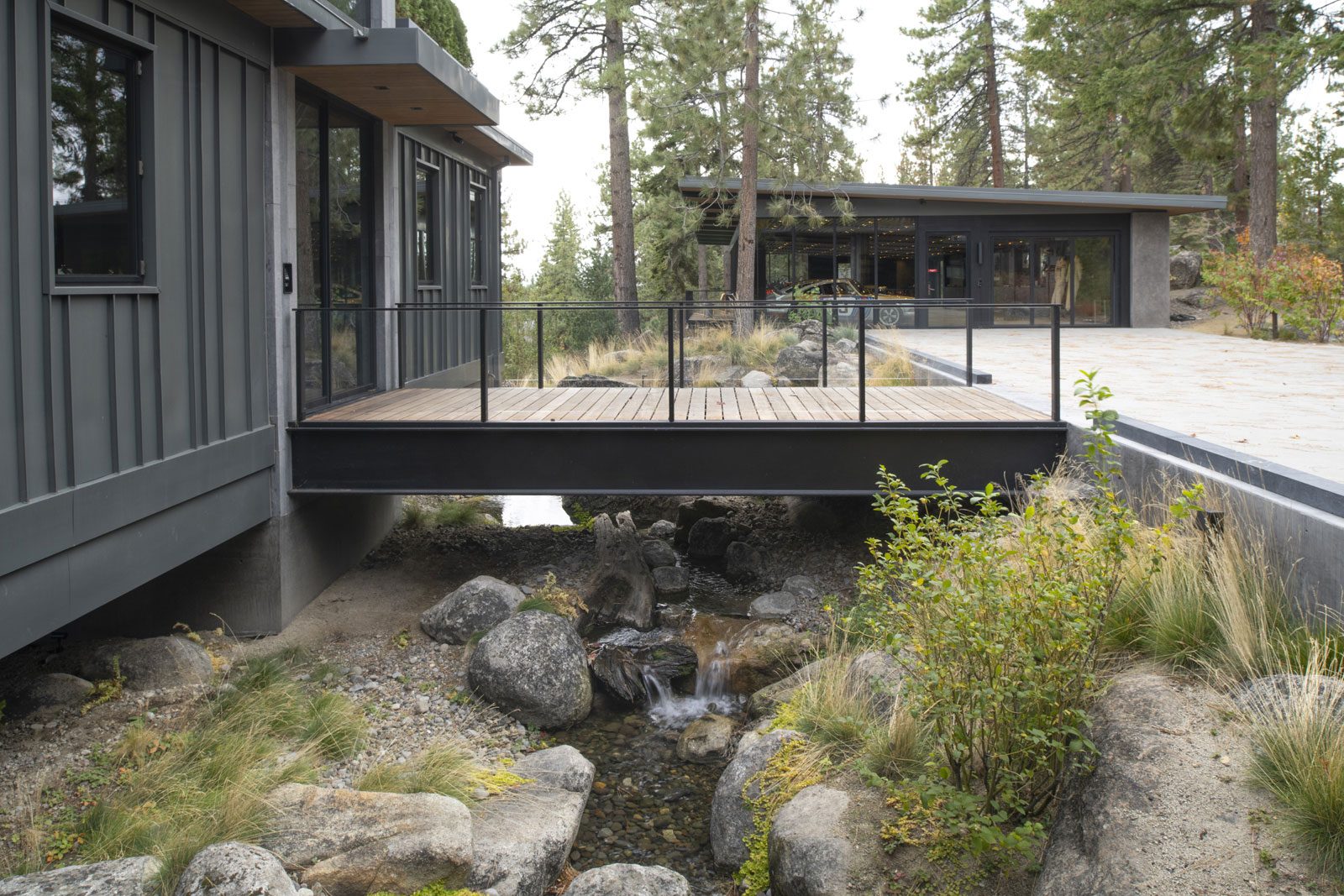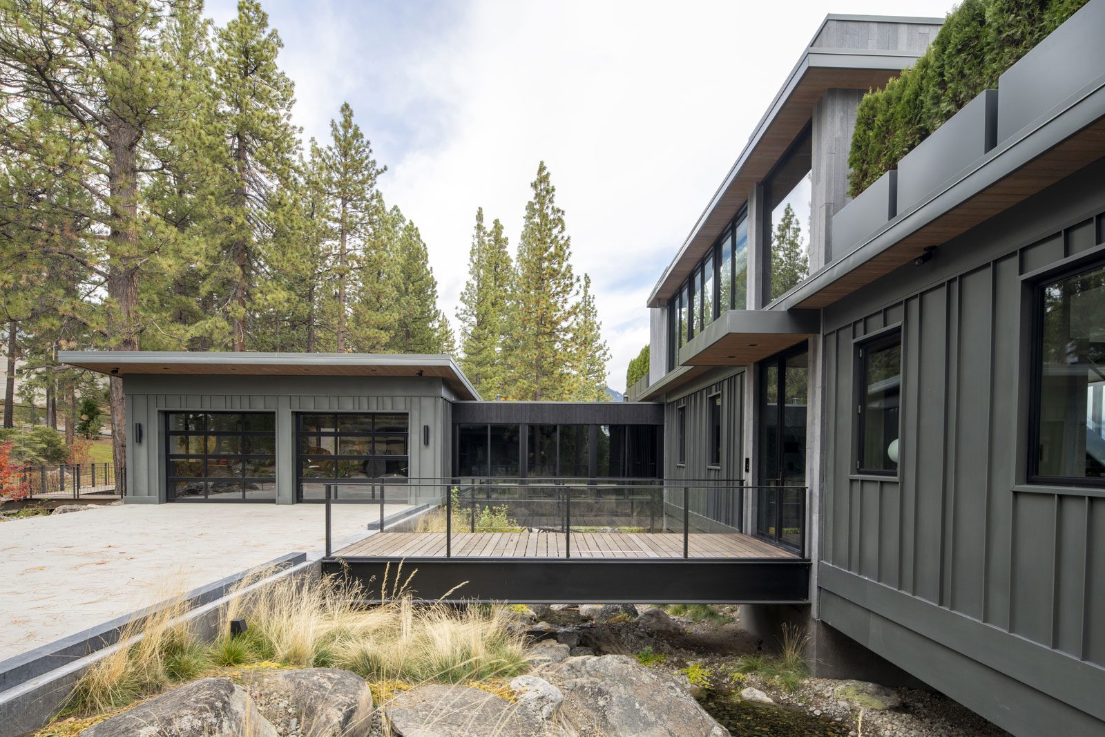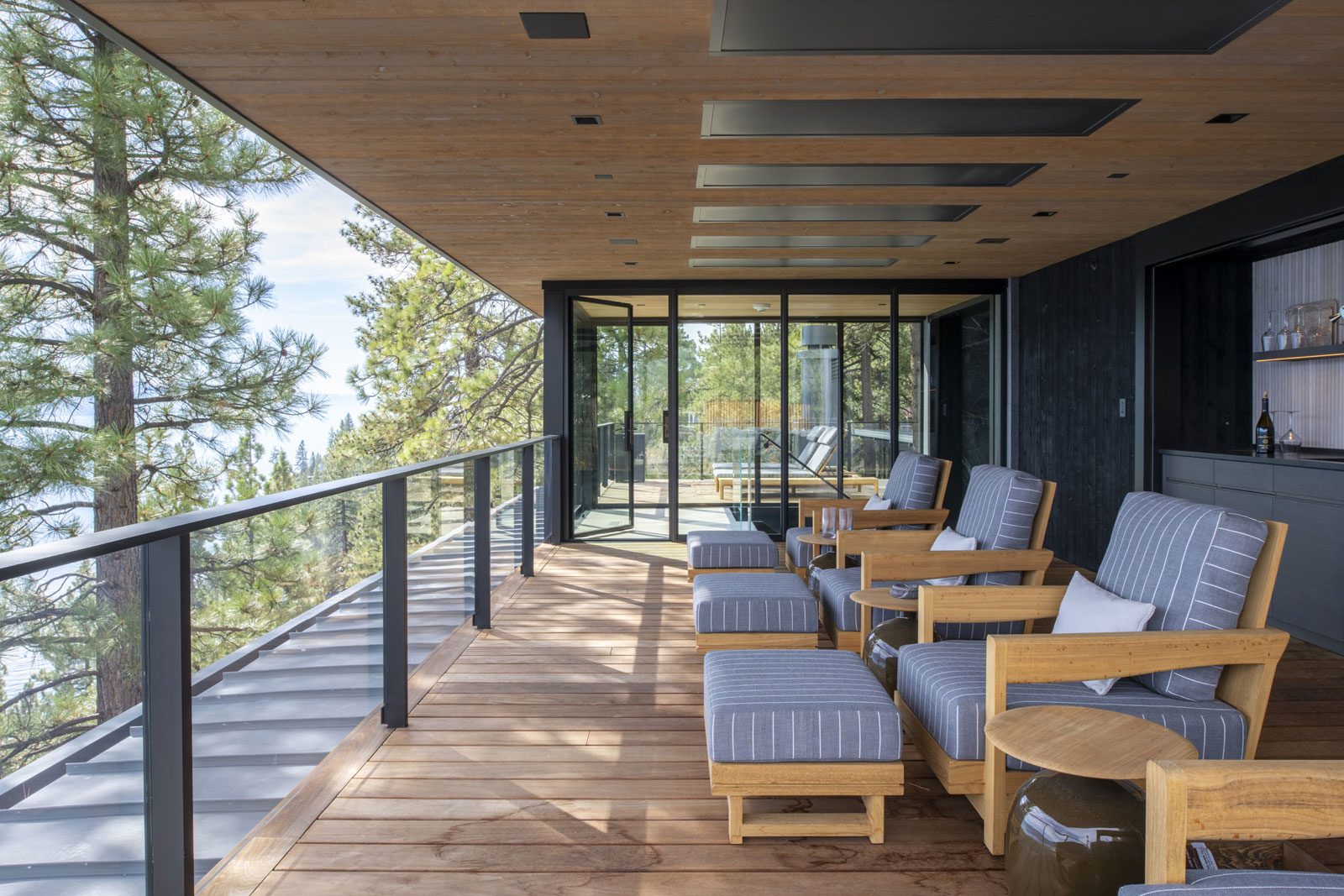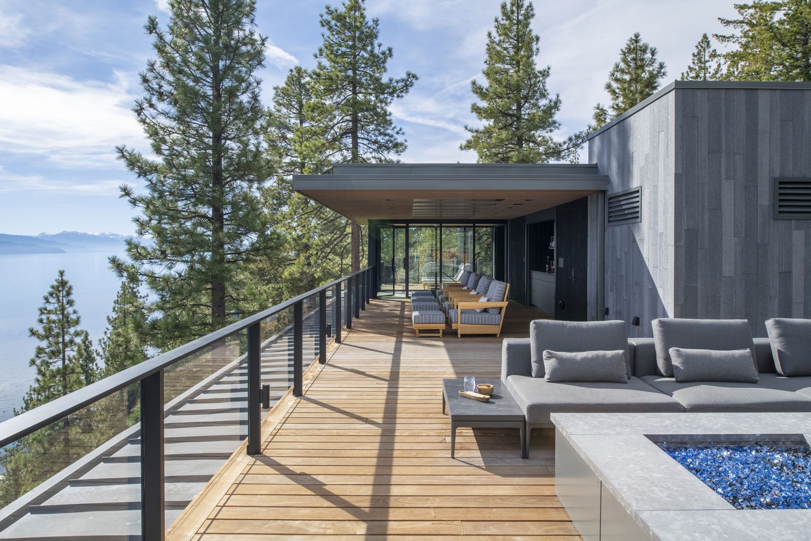The primary residence is set lightly on the land, supported on two concrete piers and cantilevered nearly thirty feet over the edge of the bluff. Water, air and views flow below the building which is connected to the garage by a skyway and to the entry court by bridge. A glass floor just inside the main entry allows a view of the boulders under the building and a first peak of the blue water far below. The design provides privacy from the street, discretely conceal the heroic structural steel and mass timber required to meet heavy snow load and seismic requirements and capture views through the trees to the lake and ski slopes beyond. On the rooftop, accessed by a perforated steel stair, are balconies in the treetops with an outdoor bar, moon deck and firepit. Access to the lakeshore and pier, far below these buildings, is provided by a funicular with undulating steel track hugging the contours of the site or by a stair of steel and thermally treated timber for the less faint of heart.