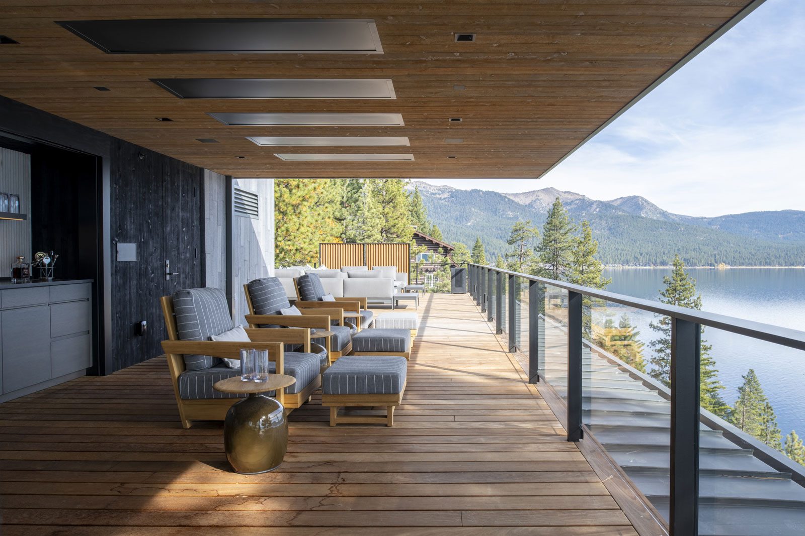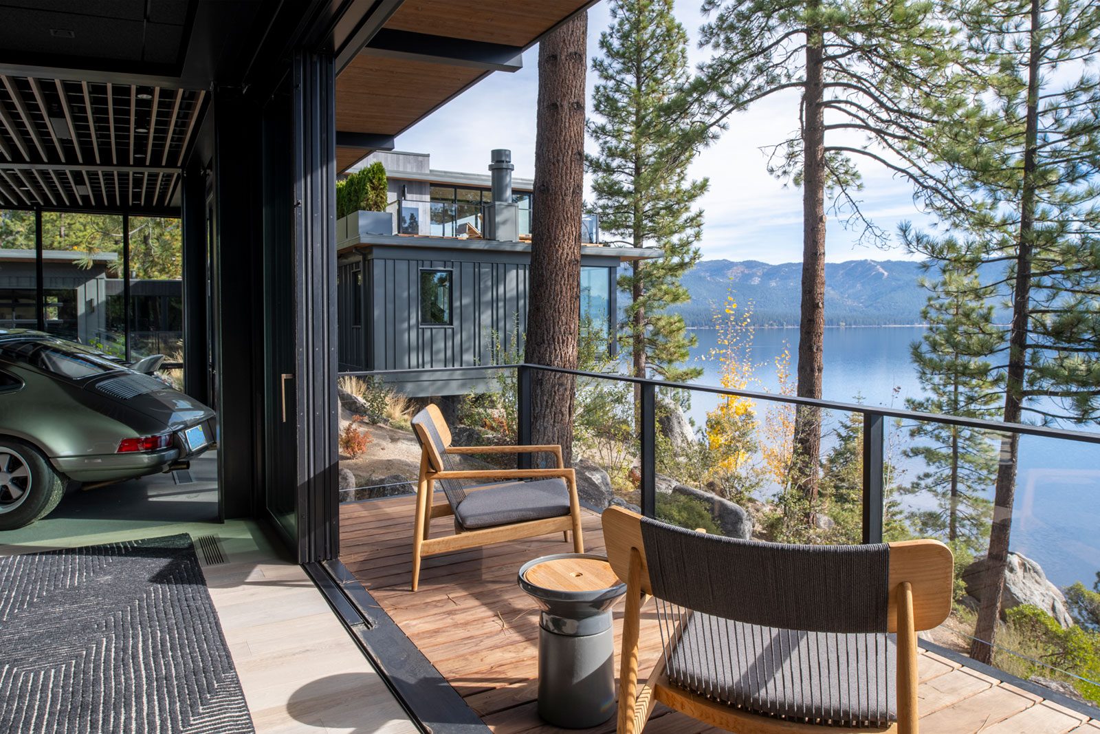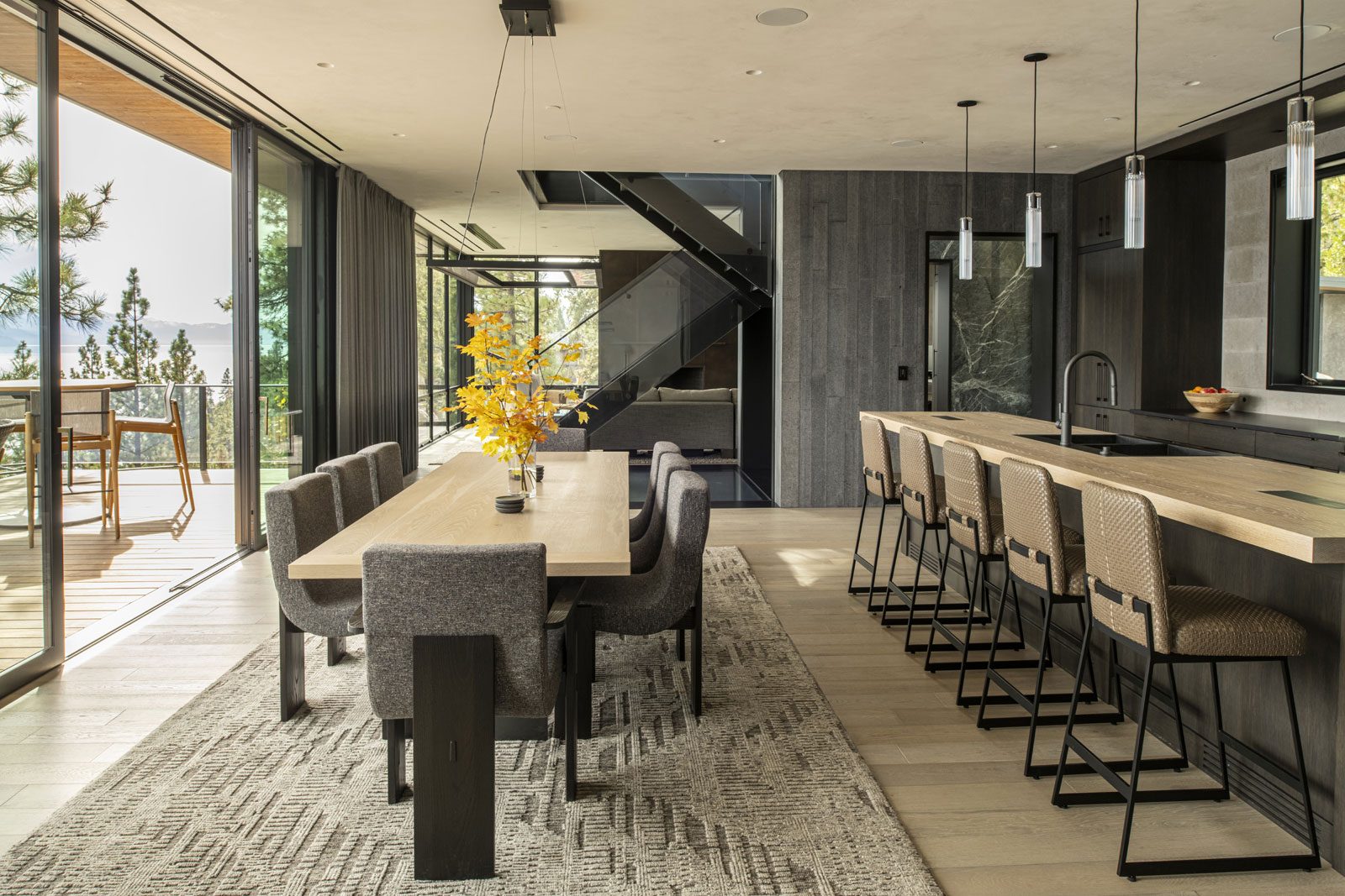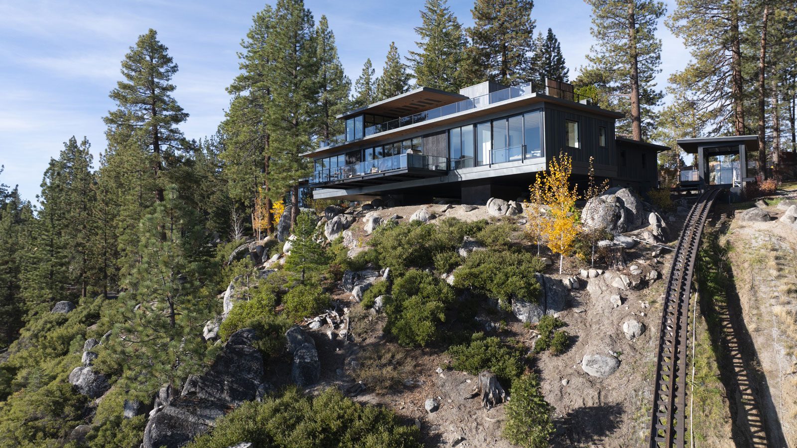 The primary residence is set lightly on the land, supported on two concrete piers and cantilevered nearly thirty feet over the edge of the bluff. Water, air and views flow below the building which is connected to the garage by a skyway and to the entry court by bridge. A glass floor just inside the main entry allows a view of the boulders under the building and a first peak of the blue water far below. The design provides privacy from the street, discretely conceal the heroic structural steel and mass timber required to meet heavy snow load and seismic requirements and capture views through the trees to the lake and ski slopes beyond. On the rooftop, accessed by a perforated steel stair, are balconies in the treetops with an outdoor bar, moon deck and firepit. Access to the lakeshore and pier, far below these buildings, is provided by a funicular with undulating steel track hugging the contours of the site or by a stair of steel and thermally treated timber for the less faint of heart.