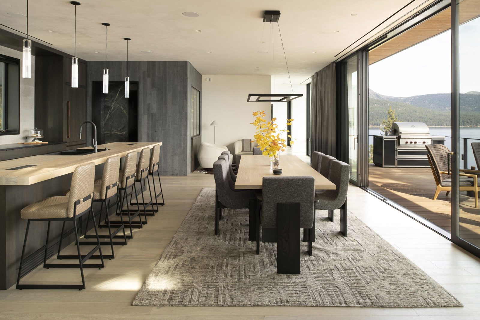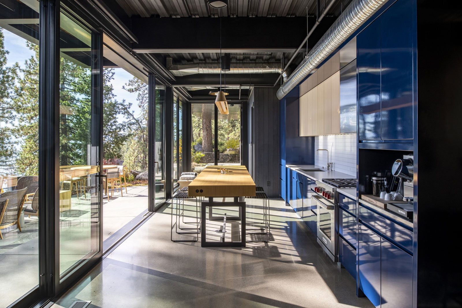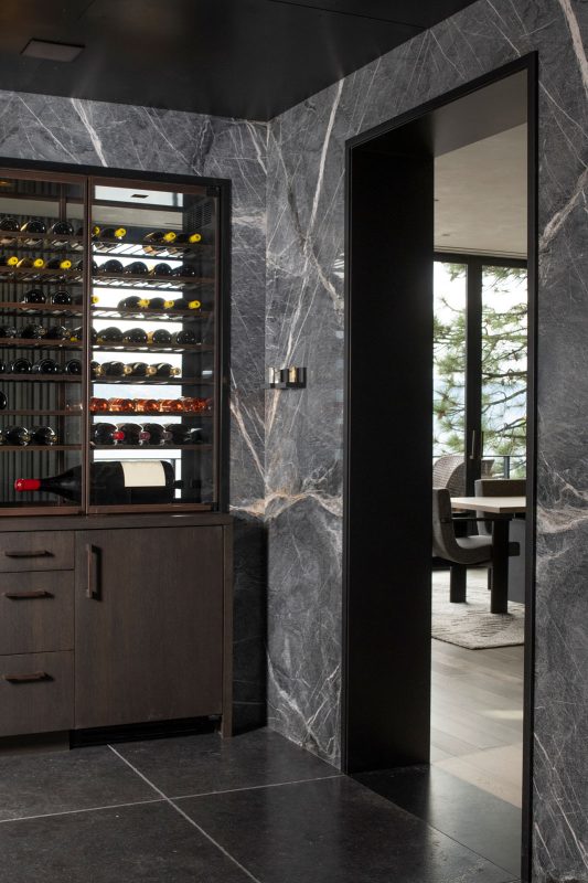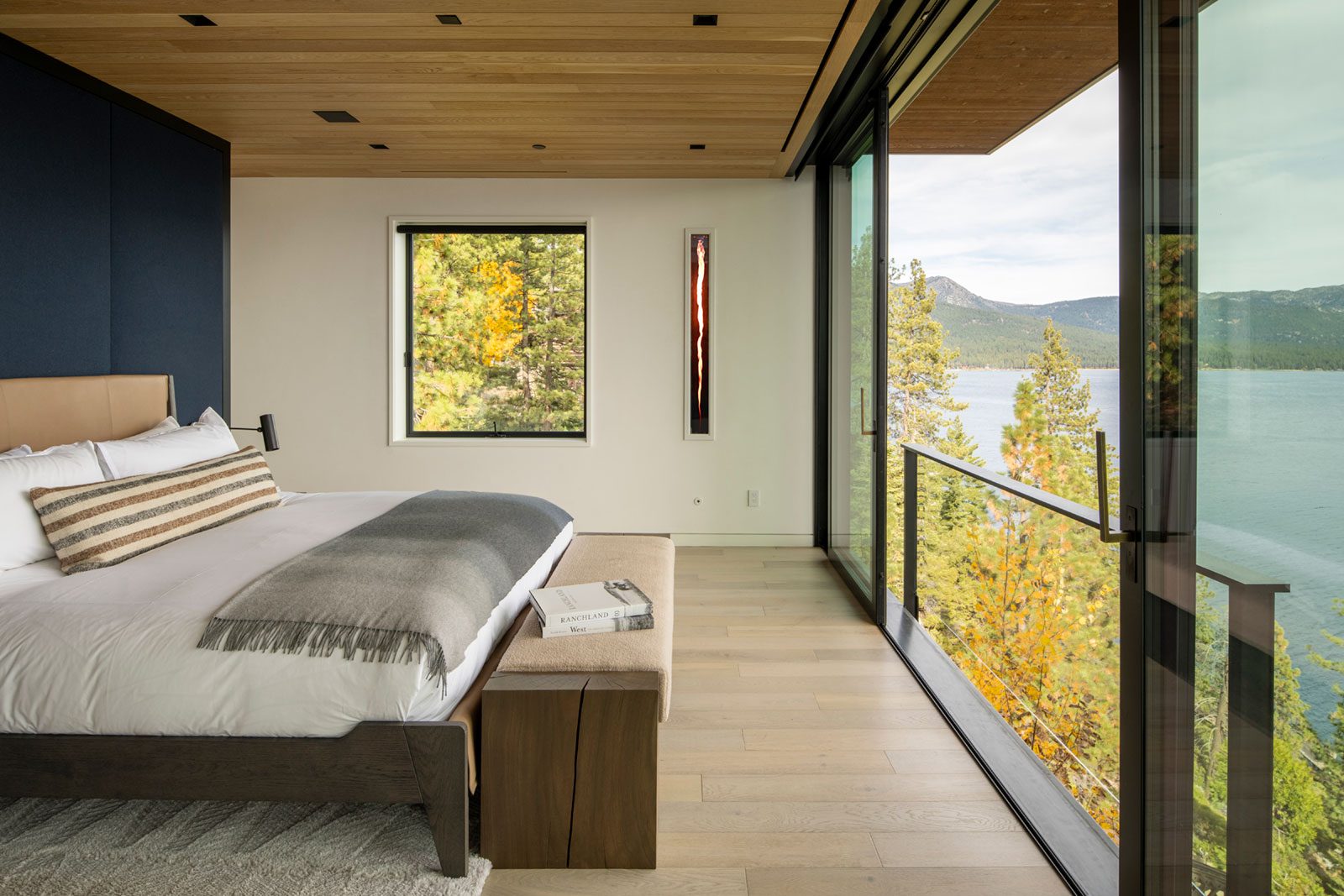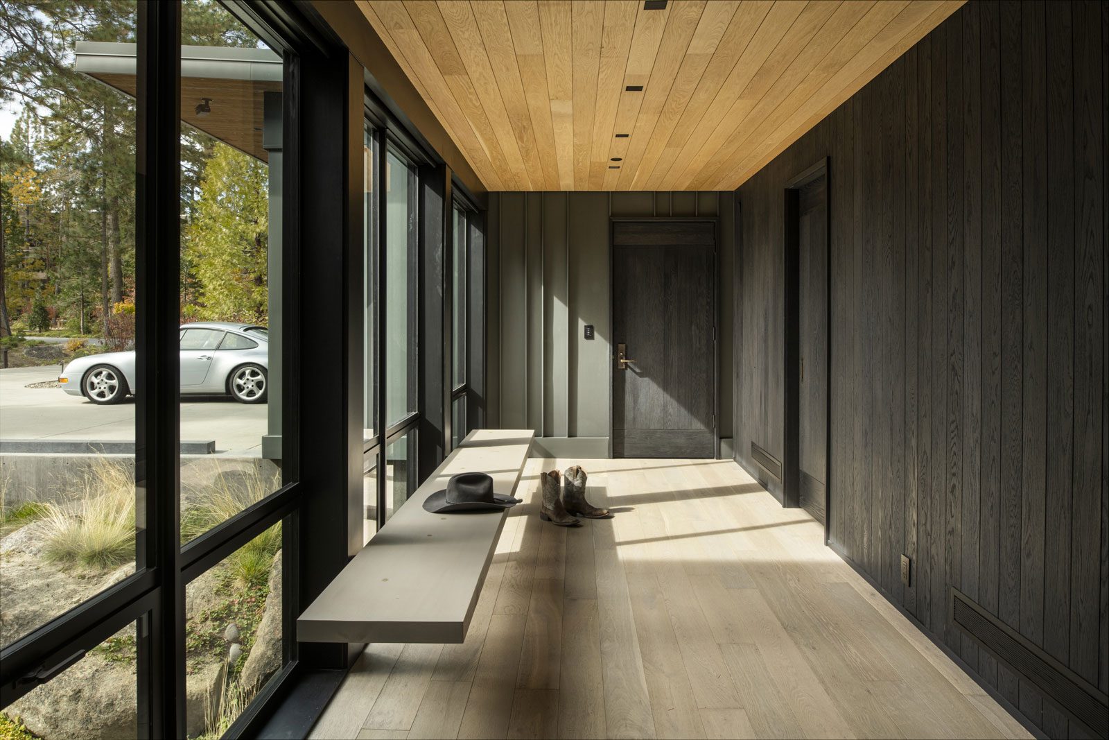 The primary residence is set lightly on the land, supported on two concrete piers and cantilevered nearly thirty feet over the edge of the bluff. Water, air and views flow below the building which is connected to the garage by a skyway and to the entry court by bridge. A glass floor just inside the main entry allows a view of the boulders under the building and a first peak of the blue water far below. The design provides privacy from the street, discretely conceal the heroic structural steel and mass timber required to meet heavy snow load and seismic requirements and capture views through the trees to the lake and ski slopes beyond. On the rooftop, accessed by a perforated steel stair, are balconies in the treetops with an outdoor bar, moon deck and firepit. Access to the lakeshore and pier, far below these buildings, is provided by a funicular with undulating steel track hugging the contours of the site or by a stair of steel and thermally treated timber for the less faint of heart.