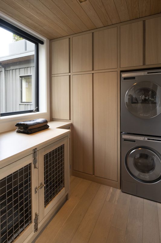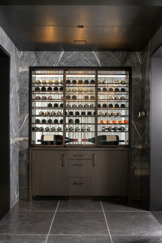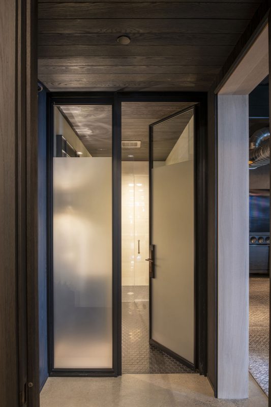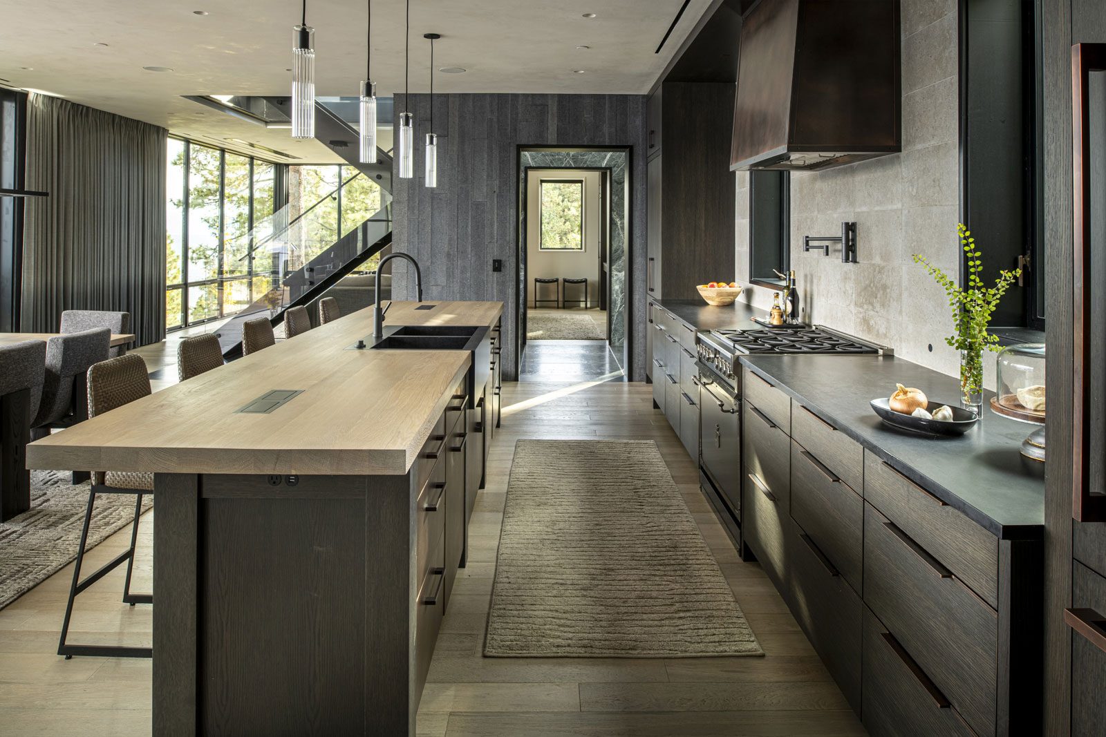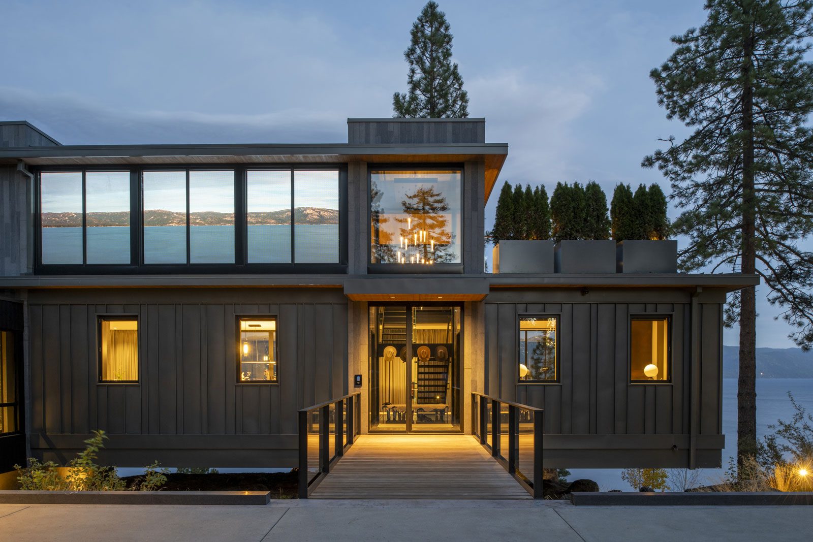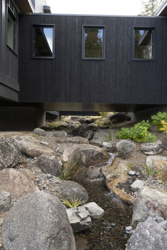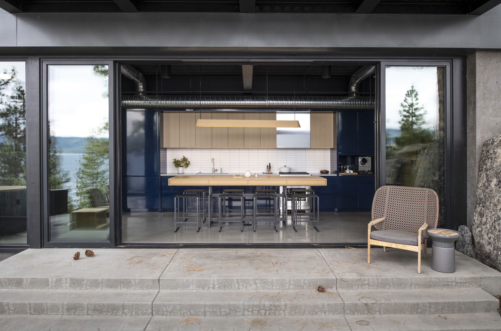 The primary residence is set lightly on the land, supported on two concrete piers and cantilevered nearly thirty feet over the edge of the bluff. Water, air and views flow below the building which is connected to the garage by a skyway and to the entry court by bridge. A glass floor just inside the main entry allows a view of the boulders under the building and a first peak of the blue water far below. The design provides privacy from the street, discretely conceal the heroic structural steel and mass timber required to meet heavy snow load and seismic requirements and capture views through the trees to the lake and ski slopes beyond. On the rooftop, accessed by a perforated steel stair, are balconies in the treetops with an outdoor bar, moon deck and firepit. Access to the lakeshore and pier, far below these buildings, is provided by a funicular with undulating steel track hugging the contours of the site or by a stair of steel and thermally treated timber for the less faint of heart.