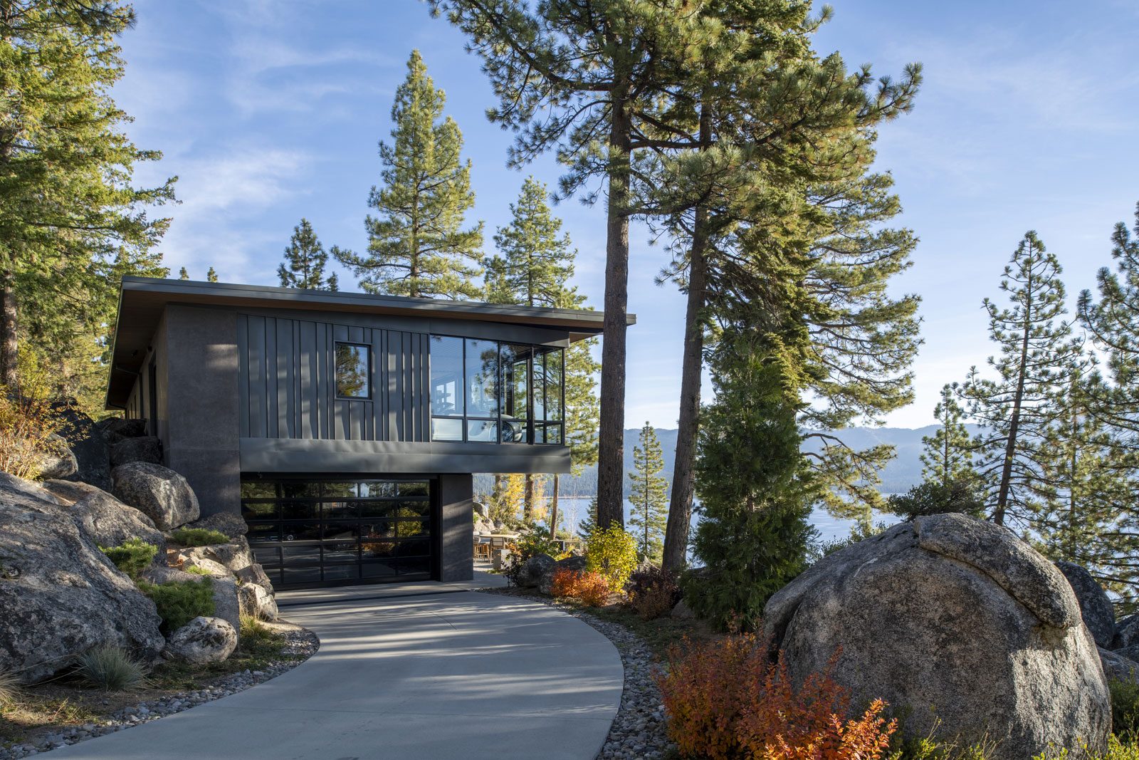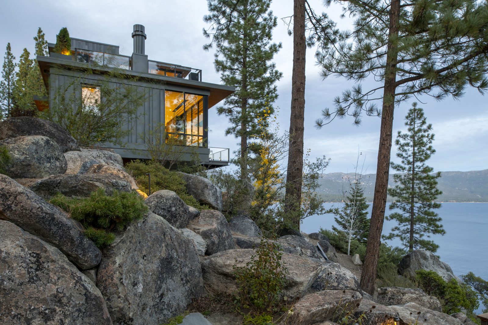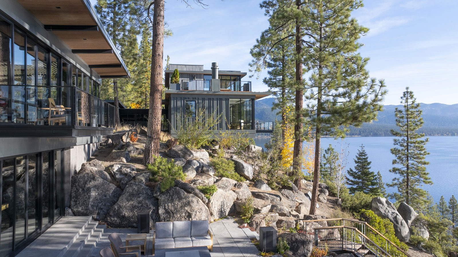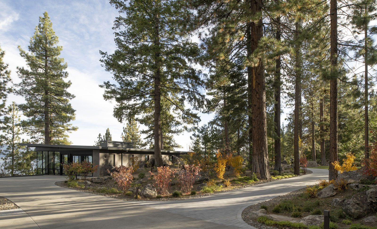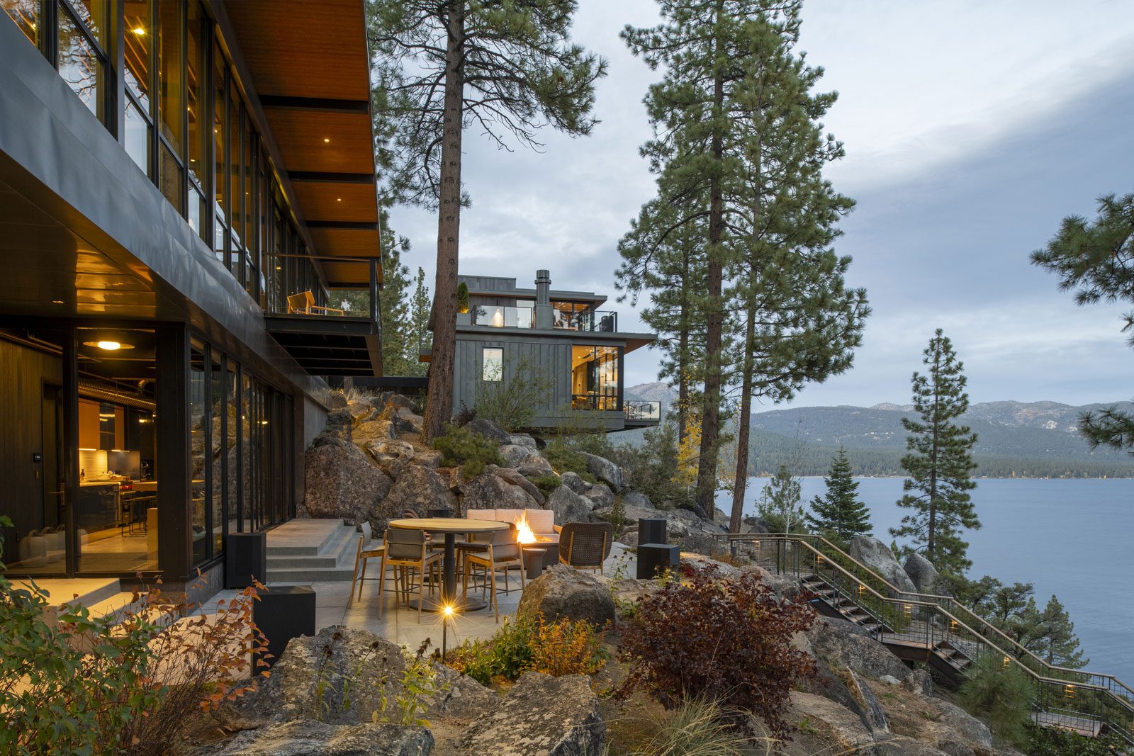 Set into a steep site 150’ above the deep blue water of Lake Tahoe, this collection of modern buildings is carefully imbedded into its landscape of granite boulders, towering pines and scrubby Manzanita. The estate, with a storied Rat Pack history, is made up of multiple adjacent properties and commands a long vista over the lake to the mountains beyond.