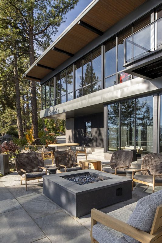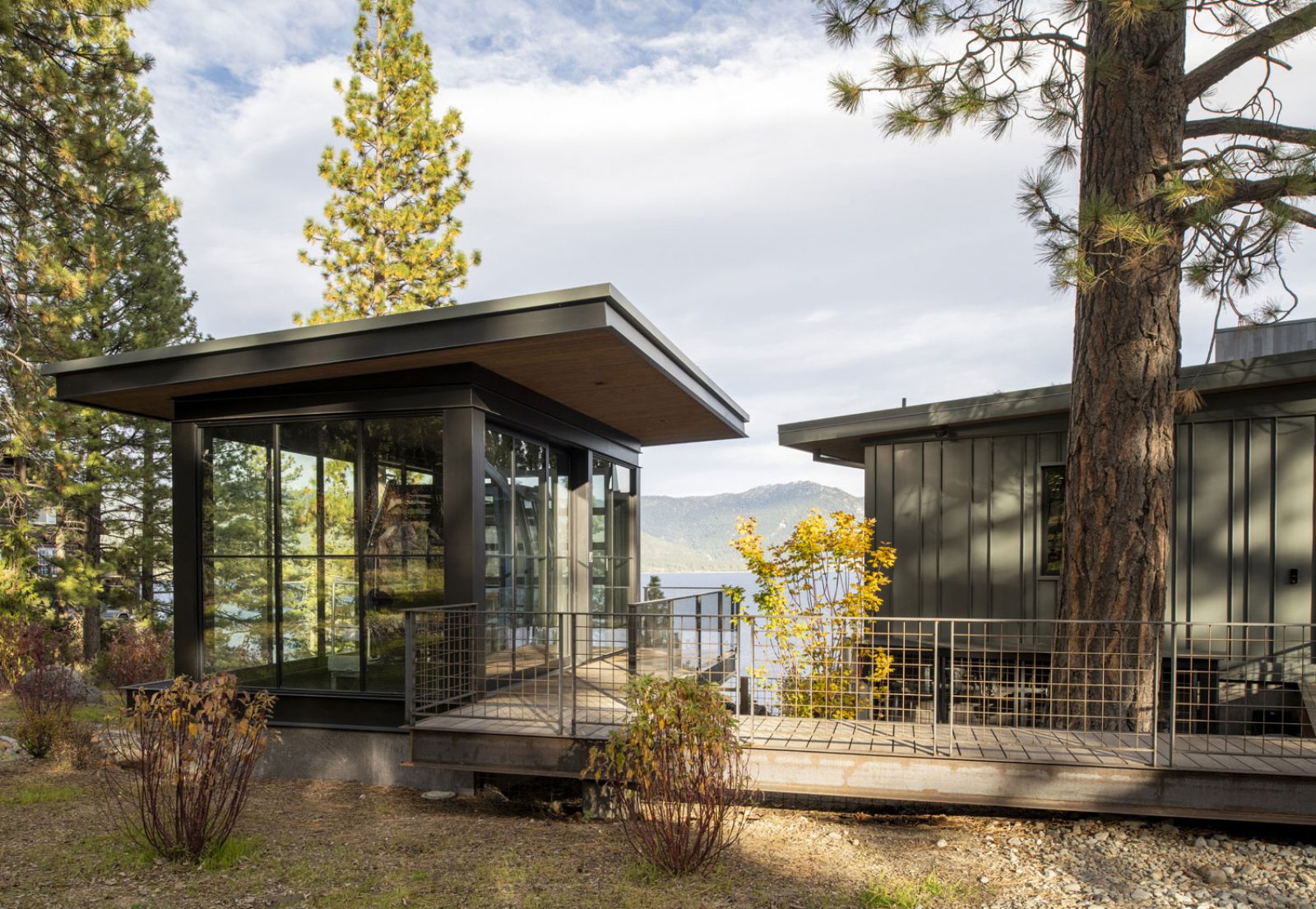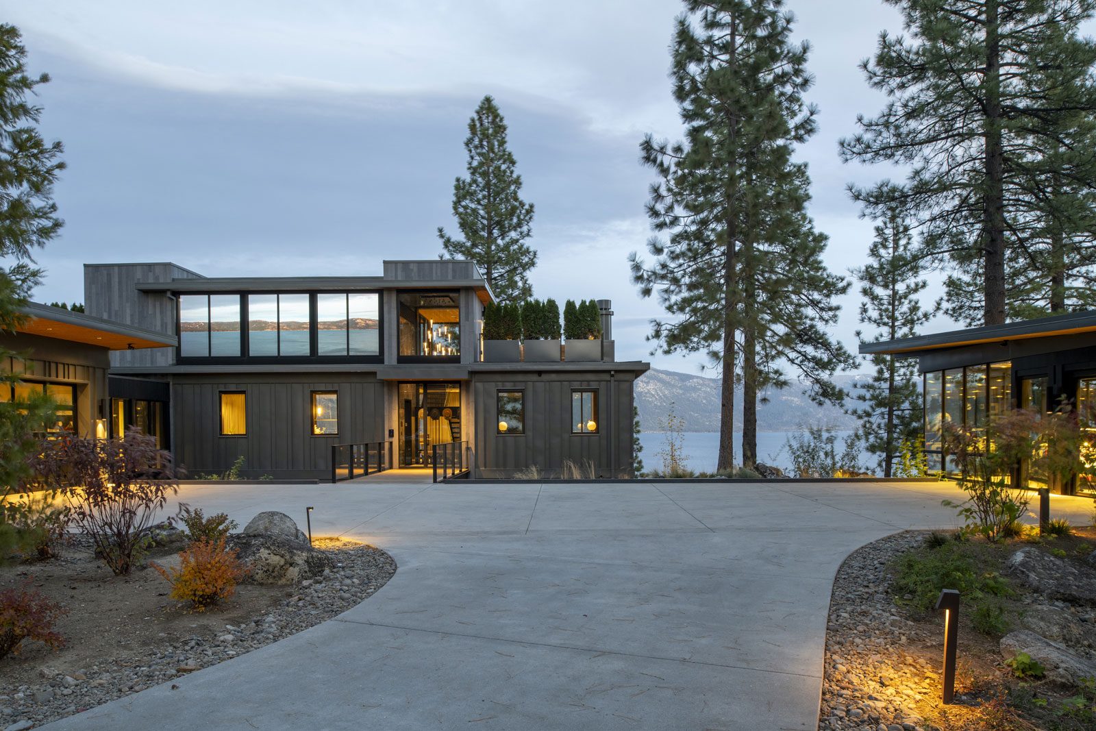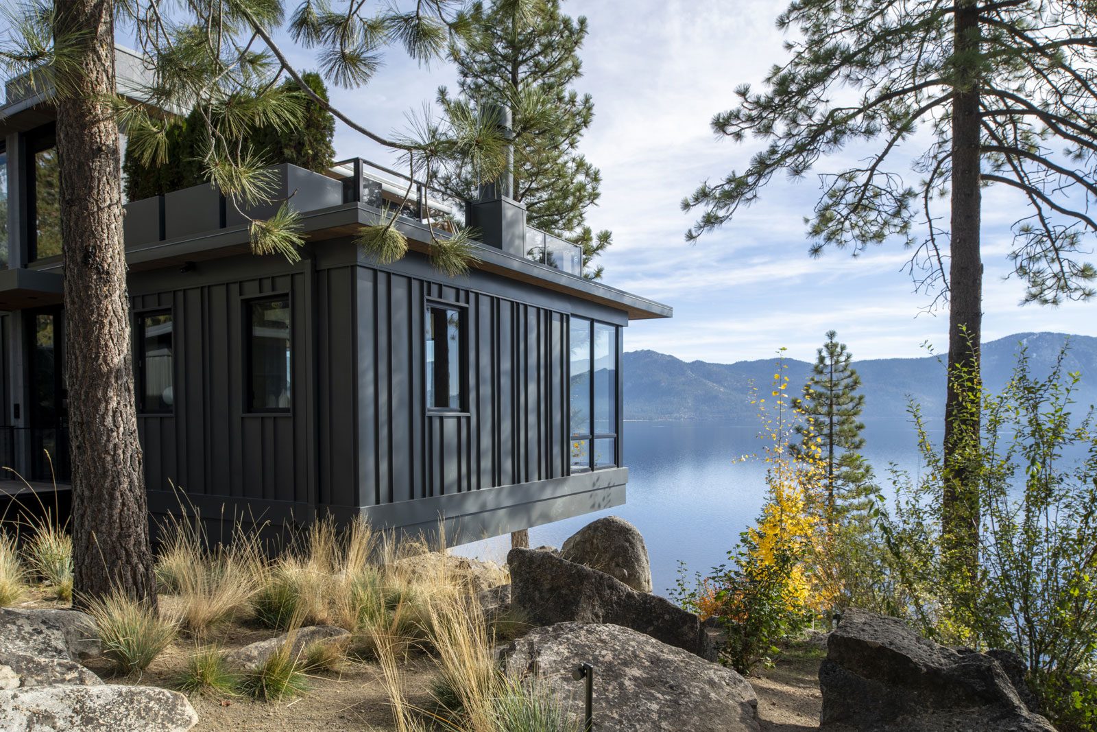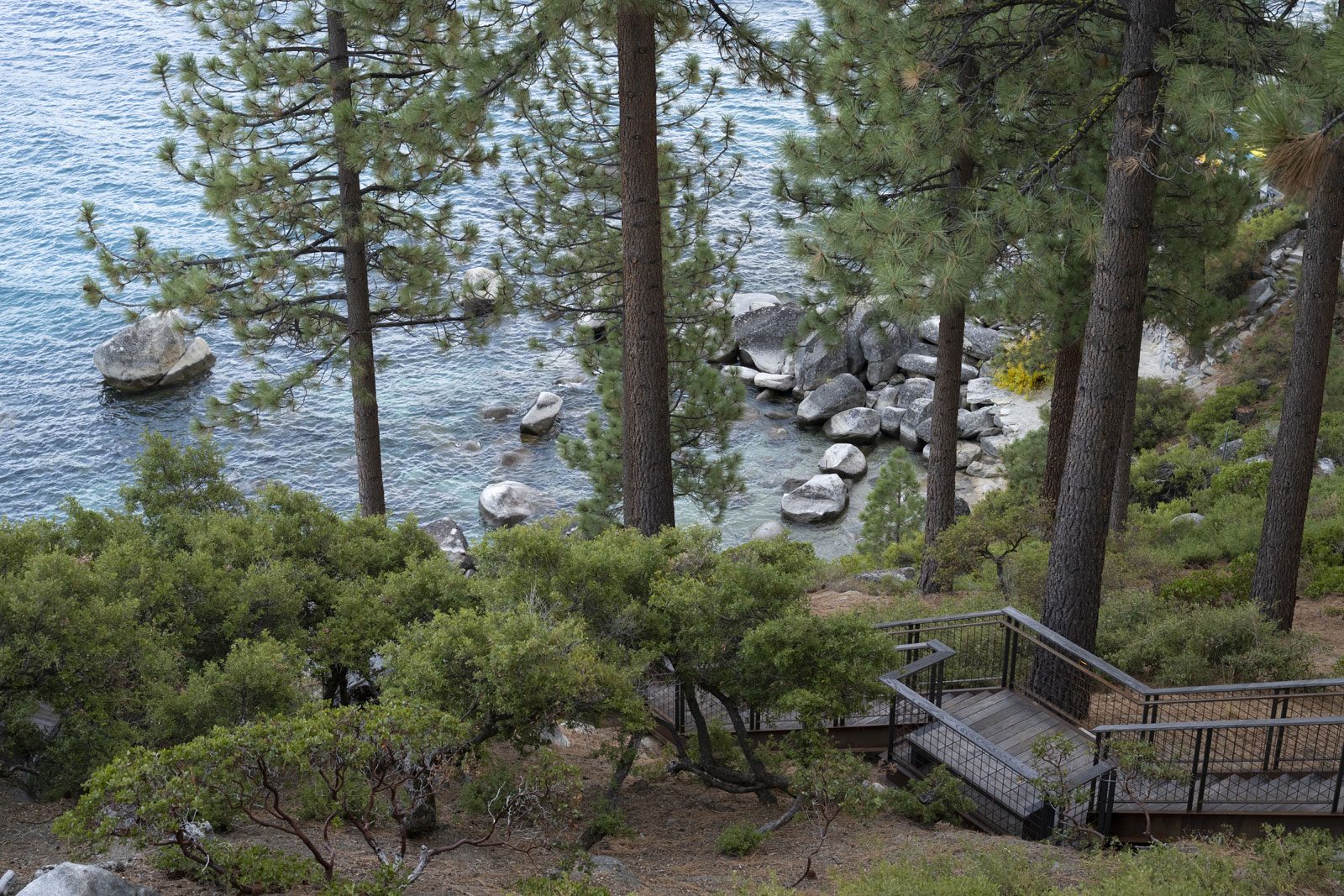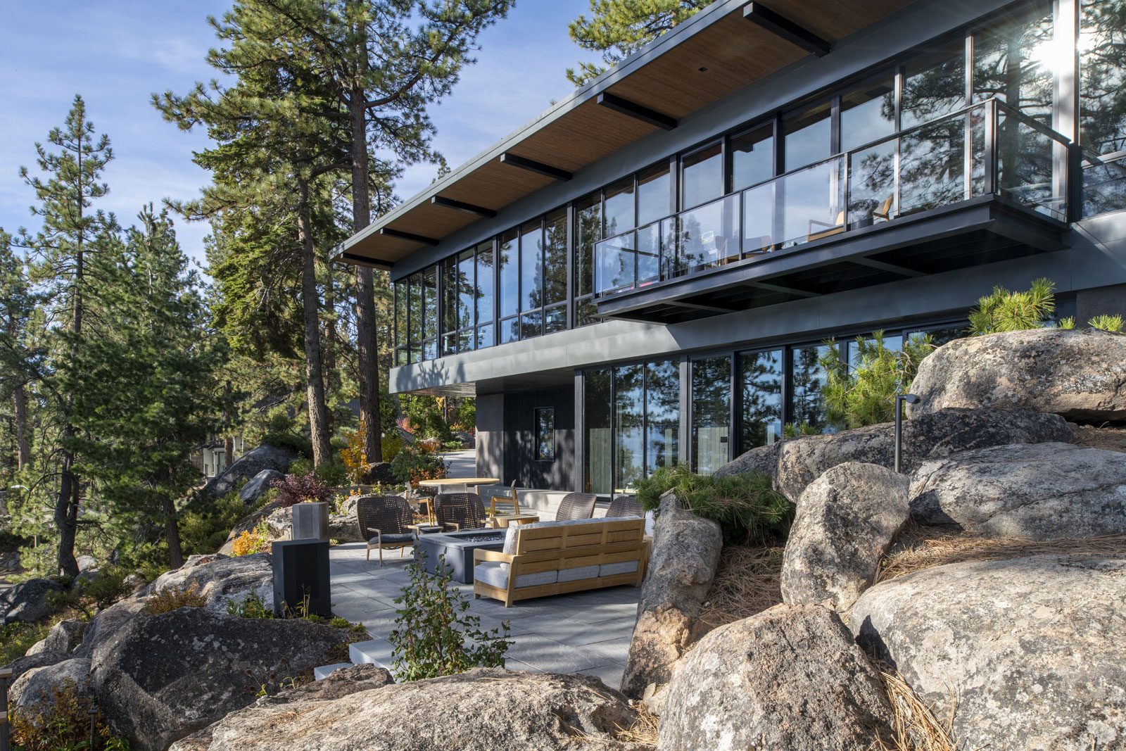 Set into a steep site 150’ above the deep blue water of Lake Tahoe, this collection of modern buildings is carefully imbedded into its landscape of granite boulders, towering pines and scrubby Manzanita. The estate, with a storied Rat Pack history, is made up of multiple adjacent properties and commands a long vista over the lake to the mountains beyond.