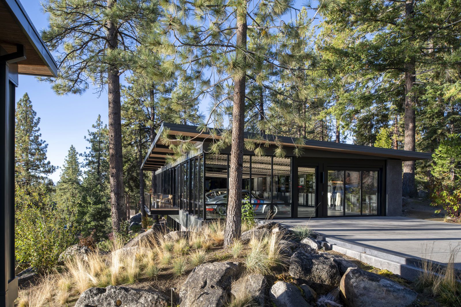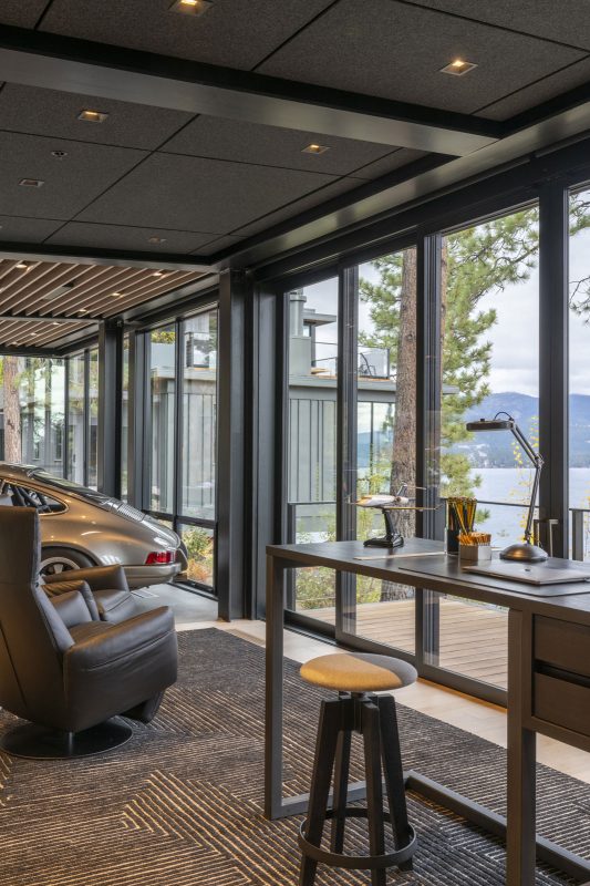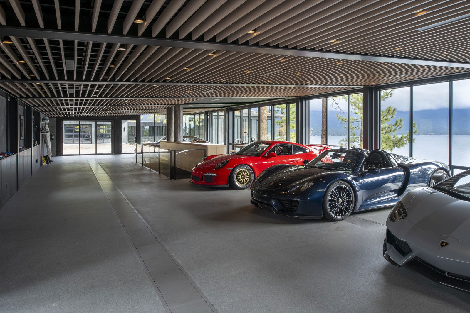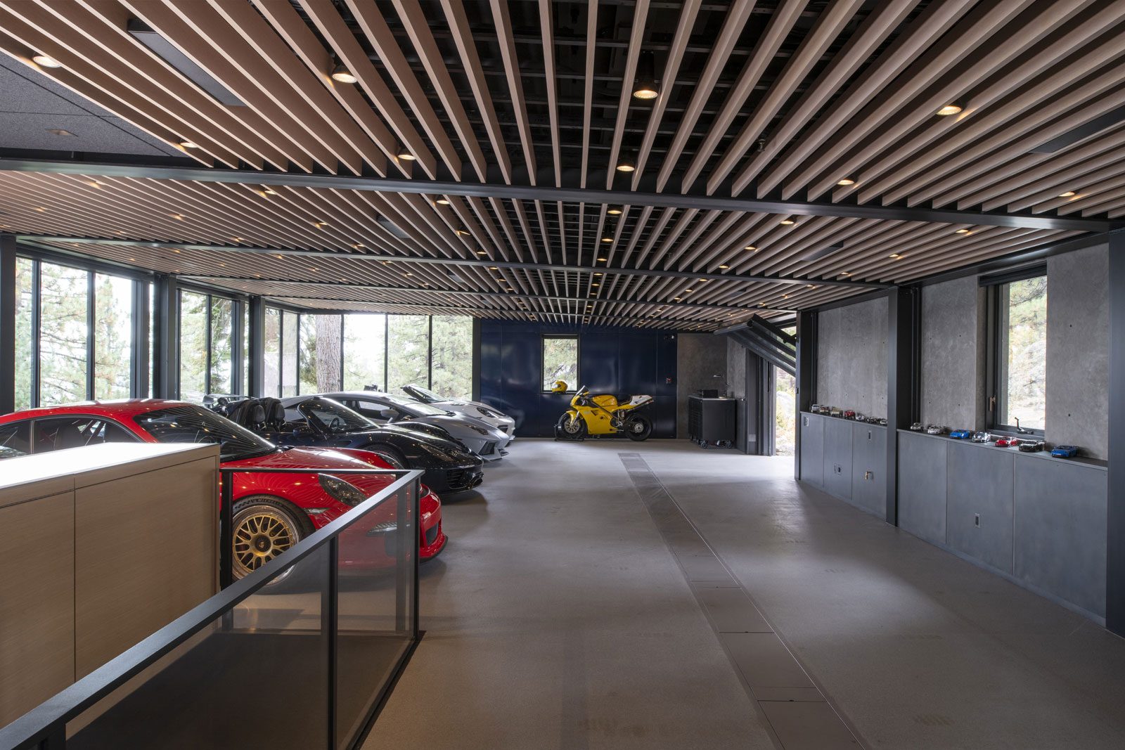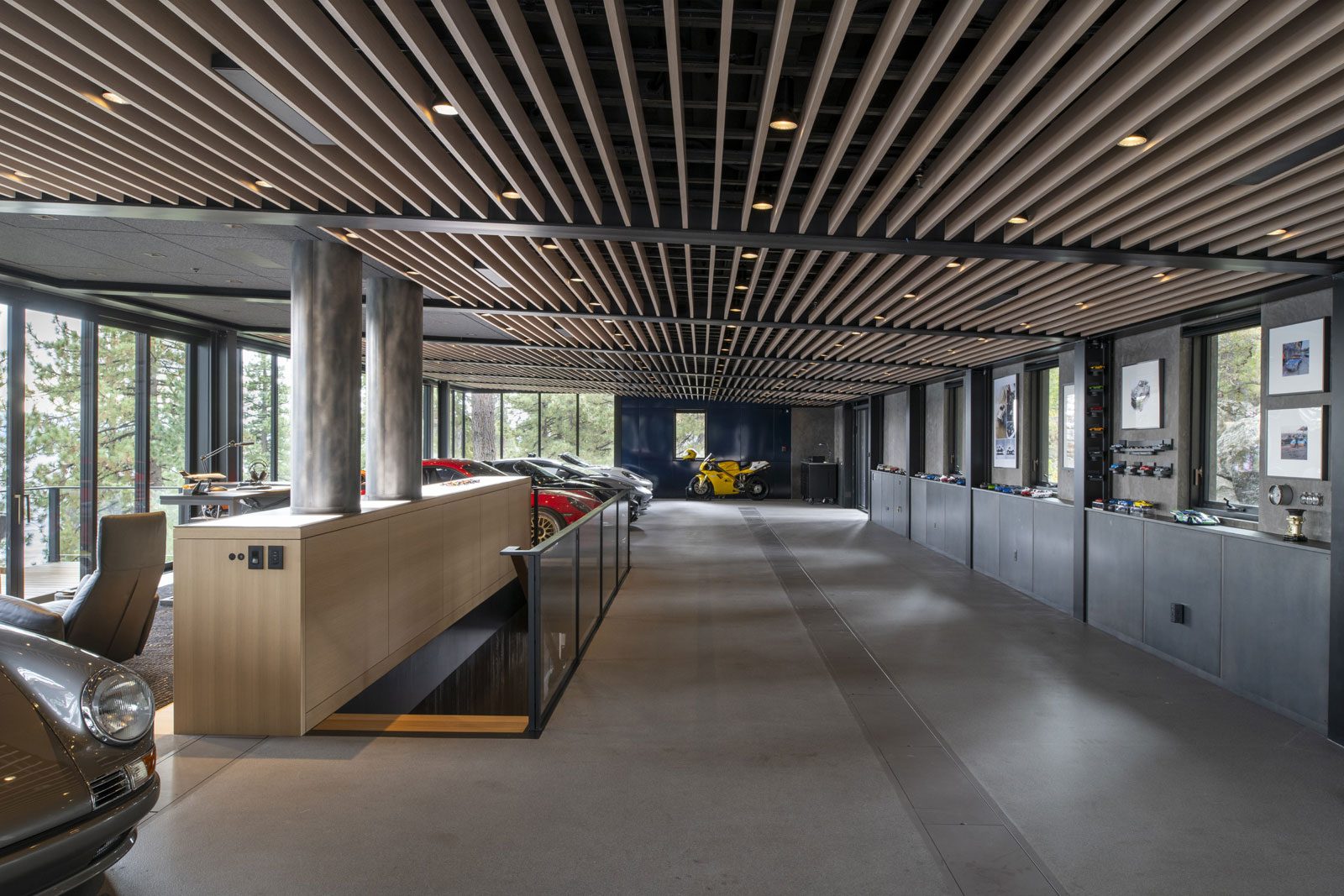 Two primary buildings are organized orthogonally along the edge of the bluff and connected by a motor-court terrace. One structure, the car barn, is set into the hillside and contains space for roadsters, office and hangout space on the upper level and utility vehicles, ski gear and kitchen on the lower level. Sleek cabinetry and custom furniture conceal functional support on both levels for bar, refrigeration, office supplies and tools. The upper level has two access points for cars to circulate, a back wall of site cast concrete and a wood slat ceiling concealing lighting, speakers and acoustic treatment. The entire lakeside is wrapped with a curtainwall of stainless steel and glass. The lower level, accessed by a ramped driveway provides utility space below grade and access out to a terrace set into the boulders and trees.