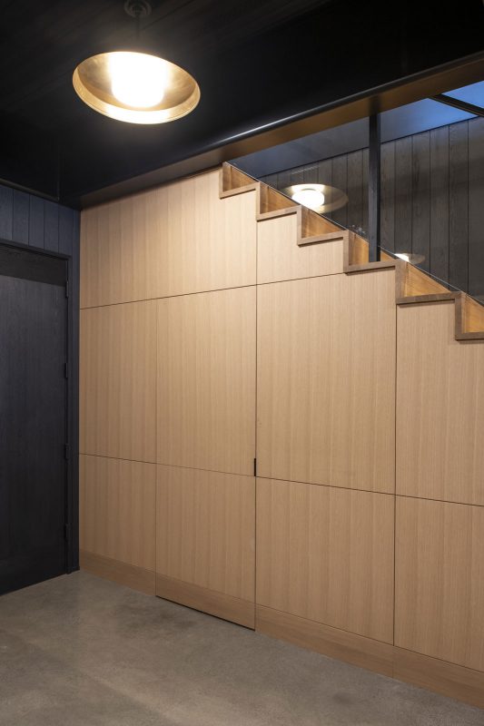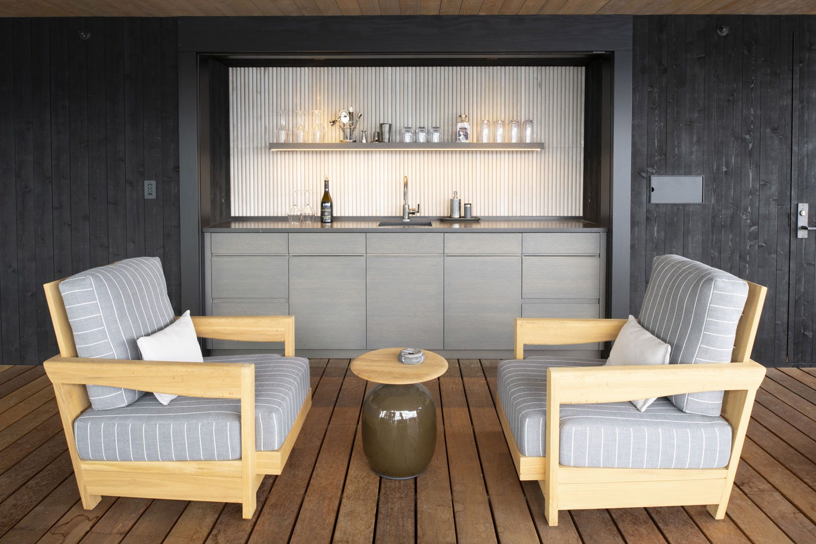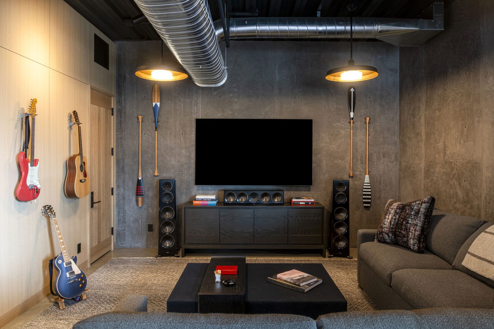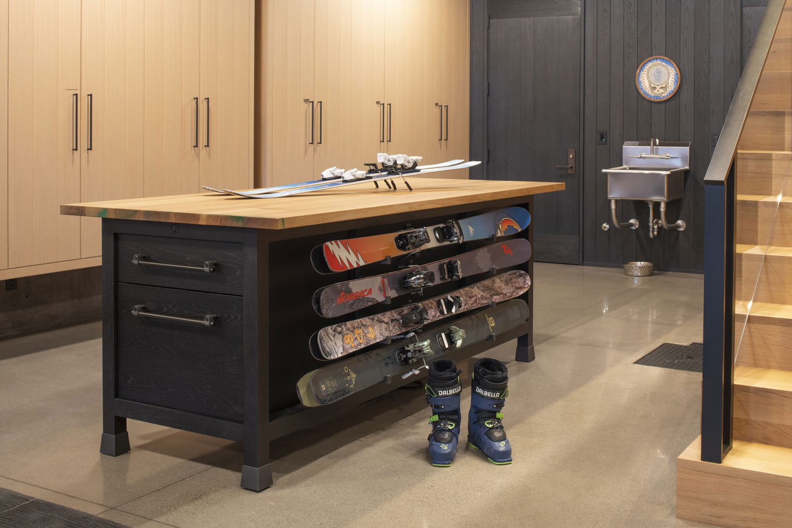 Two primary buildings are organized orthogonally along the edge of the bluff and connected by a motor-court terrace. One structure, the car barn, is set into the hillside and contains space for roadsters, office and hangout space on the upper level and utility vehicles, ski gear and kitchen on the lower level. Sleek cabinetry and custom furniture conceal functional support on both levels for bar, refrigeration, office supplies and tools. The upper level has two access points for cars to circulate, a back wall of site cast concrete and a wood slat ceiling concealing lighting, speakers and acoustic treatment. The entire lakeside is wrapped with a curtainwall of stainless steel and glass. The lower level, accessed by a ramped driveway provides utility space below grade and access out to a terrace set into the boulders and trees.