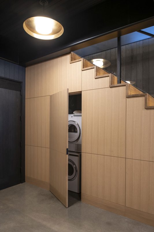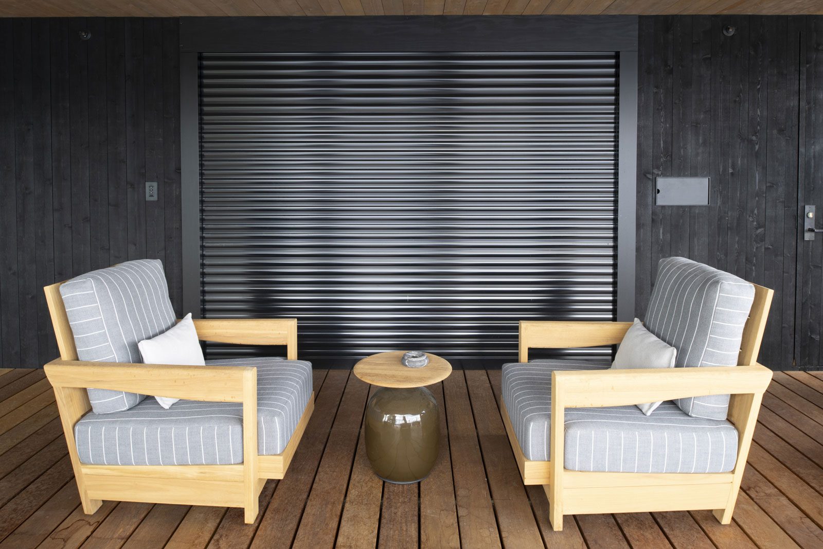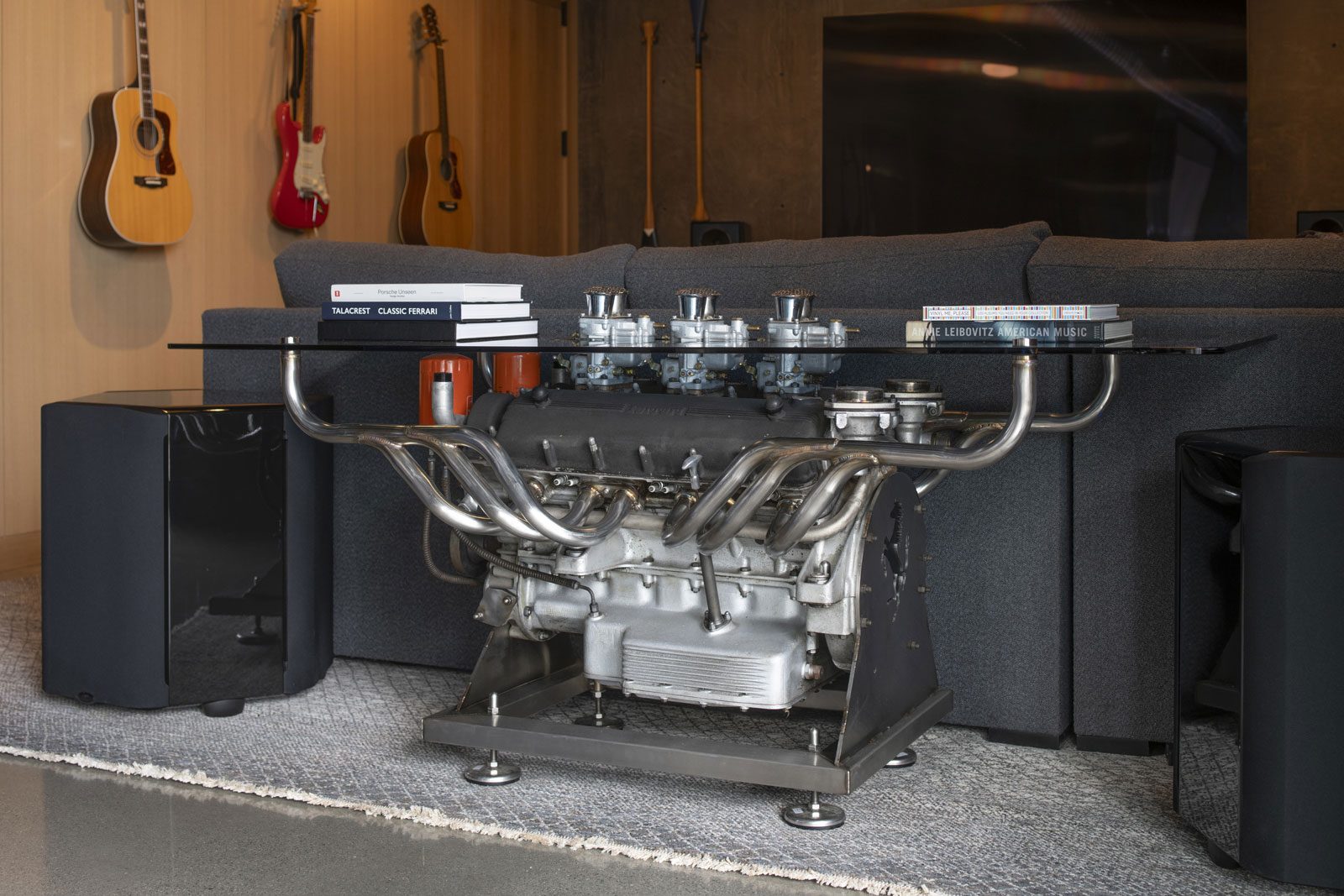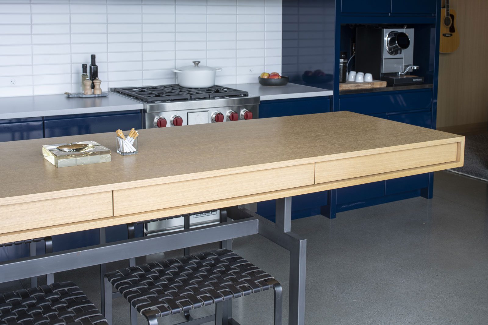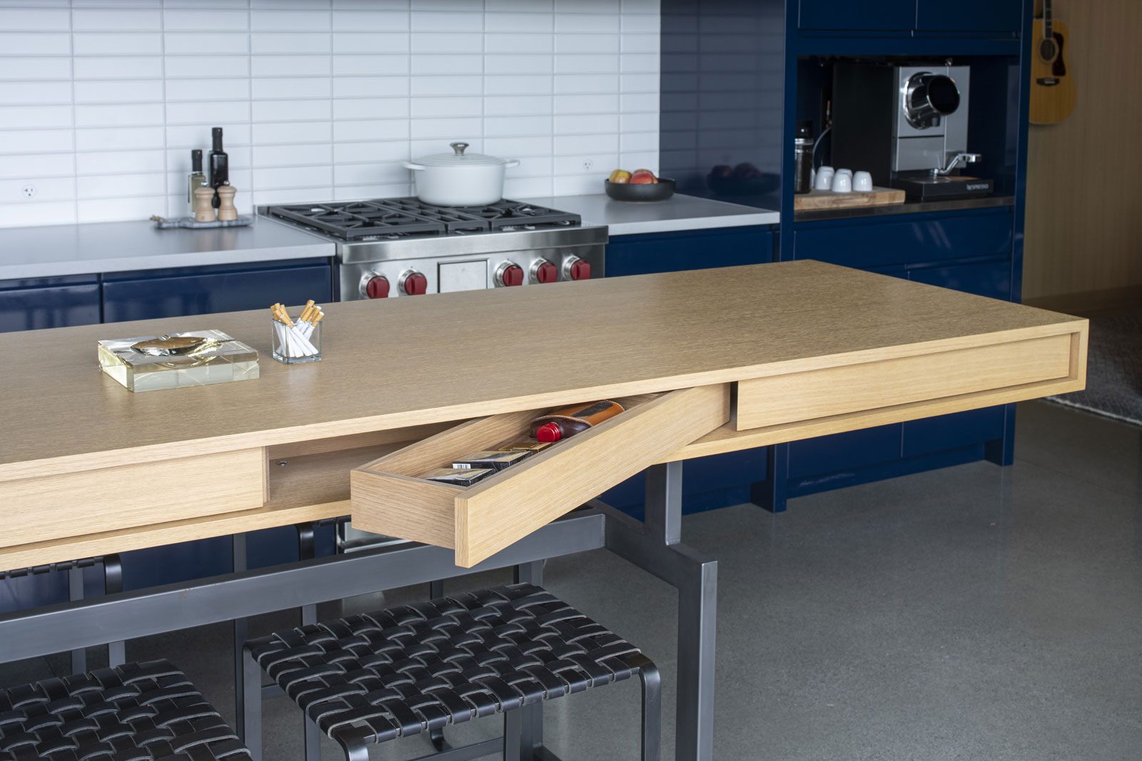 Two primary buildings are organized orthogonally along the edge of the bluff and connected by a motor-court terrace. One structure, the car barn, is set into the hillside and contains space for roadsters, office and hangout space on the upper level and utility vehicles, ski gear and kitchen on the lower level. Sleek cabinetry and custom furniture conceal functional support on both levels for bar, refrigeration, office supplies and tools. The upper level has two access points for cars to circulate, a back wall of site cast concrete and a wood slat ceiling concealing lighting, speakers and acoustic treatment. The entire lakeside is wrapped with a curtainwall of stainless steel and glass. The lower level, accessed by a ramped driveway provides utility space below grade and access out to a terrace set into the boulders and trees.