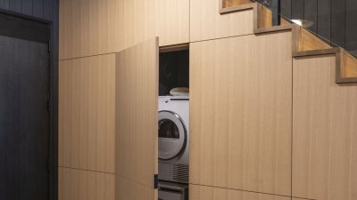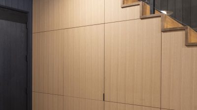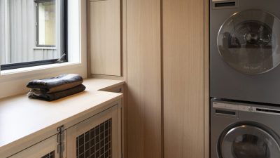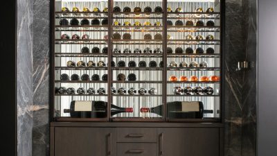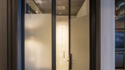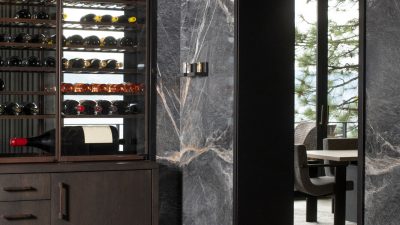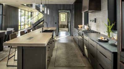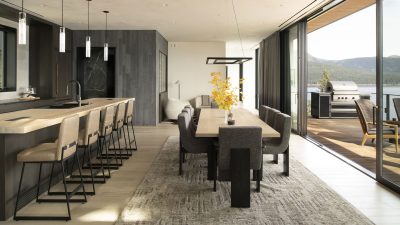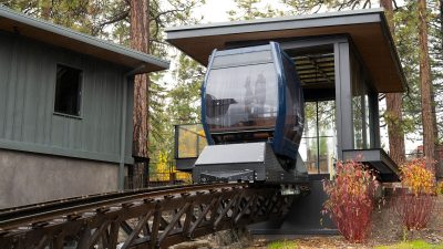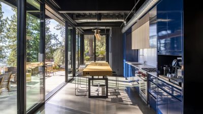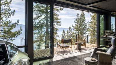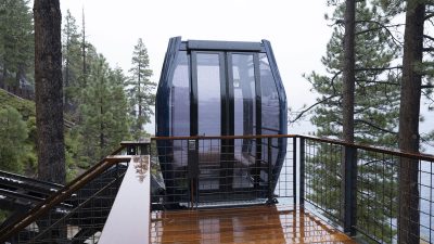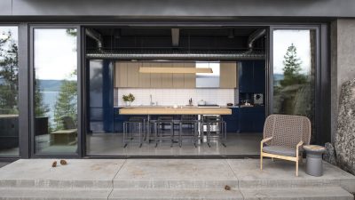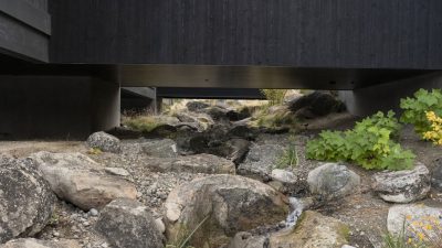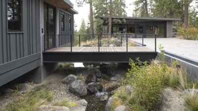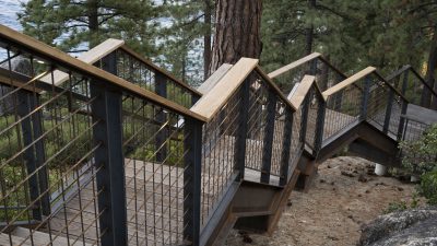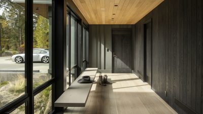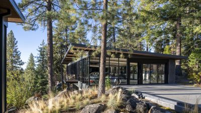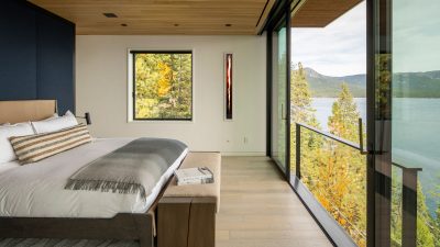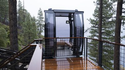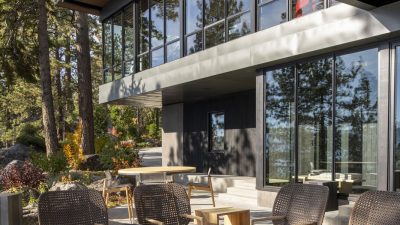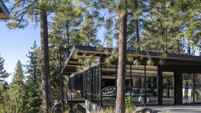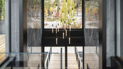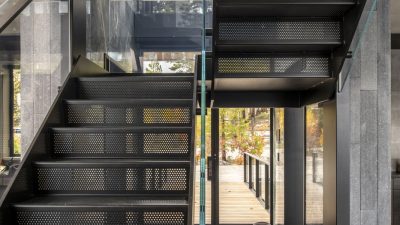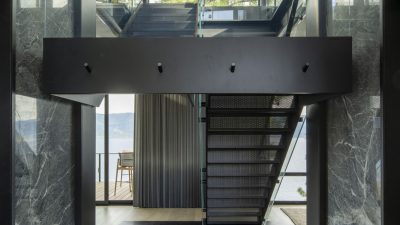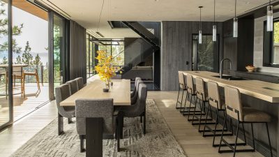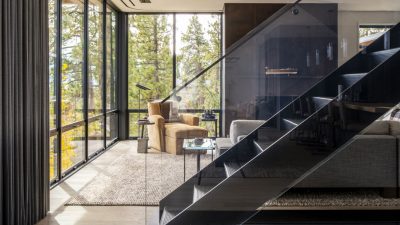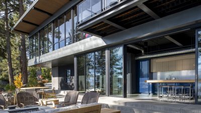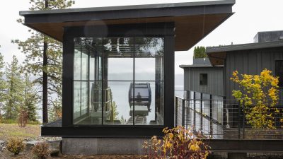 The primary residence is set lightly on the land, supported on two concrete piers and cantilevered nearly thirty feet over the edge of the bluff. Water, air and views flow below the building which is connected to the garage by a skyway and to the entry court by bridge. A glass floor just inside the main entry allows a view of the boulders under the building and a first peak of the blue water far below. The design provides privacy from the street, discretely conceal the heroic structural steel and mass timber required to meet heavy snow load and seismic requirements and capture views through the trees to the lake and ski slopes beyond. On the rooftop, accessed by a perforated steel stair, are balconies in the treetops with an outdoor bar, moon deck and firepit. Access to the lakeshore and pier, far below these buildings, is provided by a funicular with undulating steel track hugging the contours of the site or by a stair of steel and thermally treated timber for the less faint of heart.