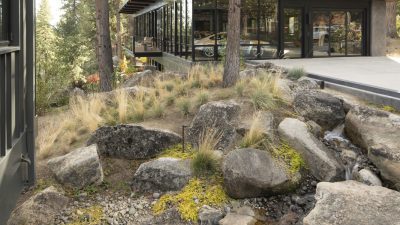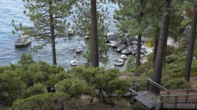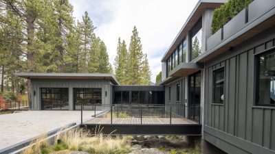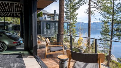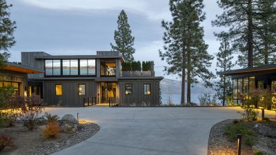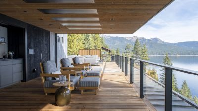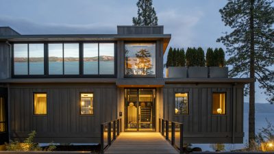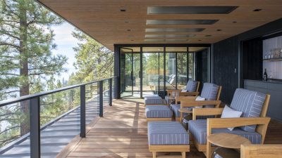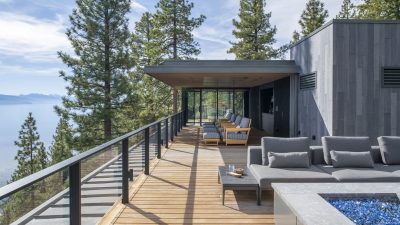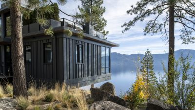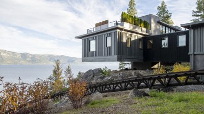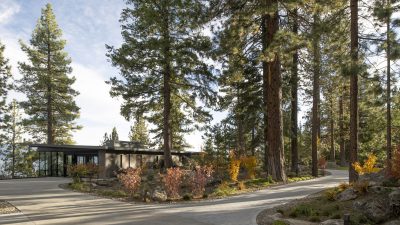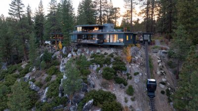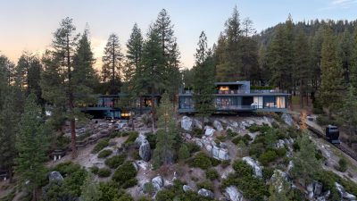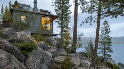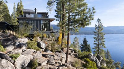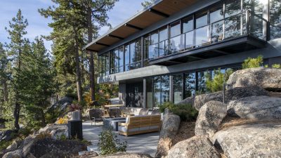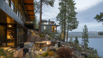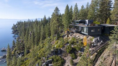 Set into a steep site 150’ above the deep blue water of Lake Tahoe, this collection of modern buildings is carefully imbedded into its landscape of granite boulders, towering pines and scrubby Manzanita. The estate, with a storied Rat Pack history, is made up of multiple adjacent properties and commands a long vista over the lake to the mountains beyond.