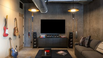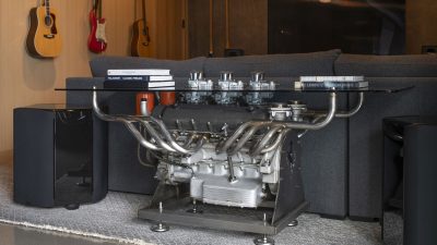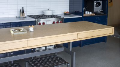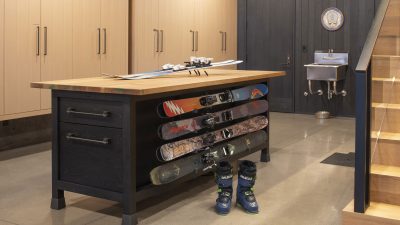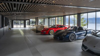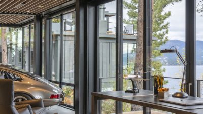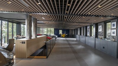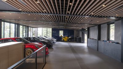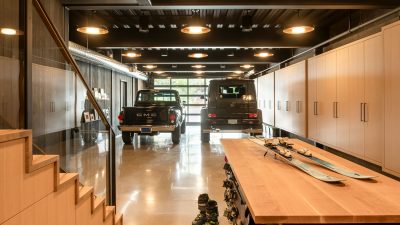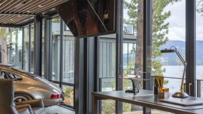 Two primary buildings are organized orthogonally along the edge of the bluff and connected by a motor-court terrace. One structure, the car barn, is set into the hillside and contains space for roadsters, office and hangout space on the upper level and utility vehicles, ski gear and kitchen on the lower level. Sleek cabinetry and custom furniture conceal functional support on both levels for bar, refrigeration, office supplies and tools. The upper level has two access points for cars to circulate, a back wall of site cast concrete and a wood slat ceiling concealing lighting, speakers and acoustic treatment. The entire lakeside is wrapped with a curtainwall of stainless steel and glass. The lower level, accessed by a ramped driveway provides utility space below grade and access out to a terrace set into the boulders and trees.